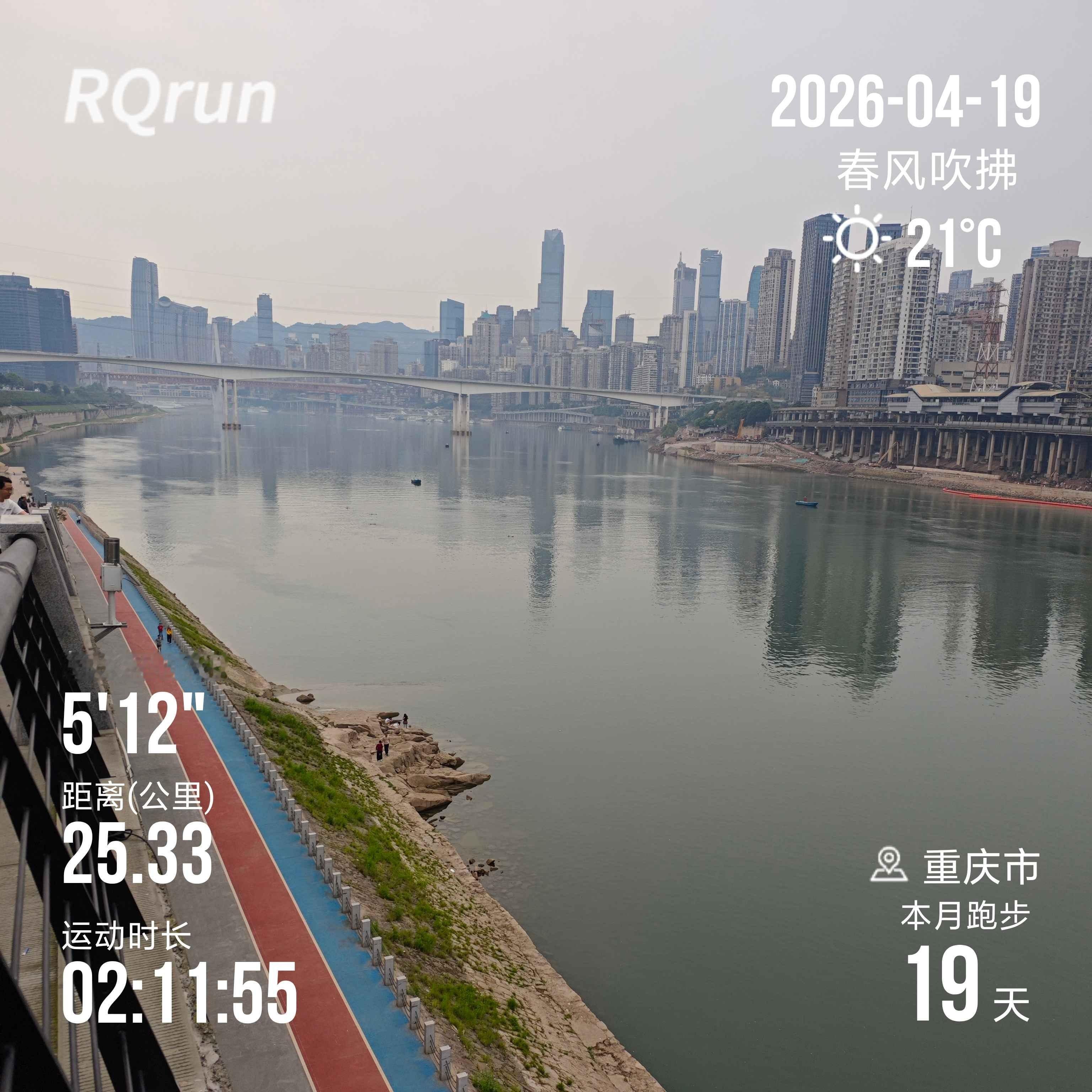 周末开跑天气预报今天暴雨,实际早上温度合适,跑起来有微风也舒服;常规路线,沿着滨江路跑,25Km完成;隔着嘉陵江,给对岸参加沙坪坝半程马拉松的朋友们,加油啊