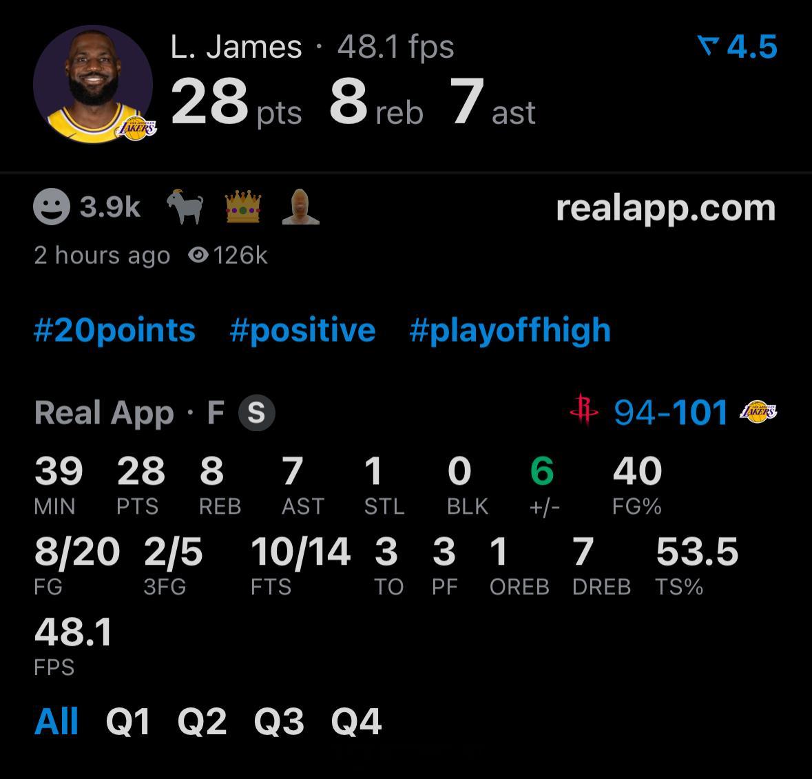 20投8中,罚球14中10,28分8篮板7助攻。如何评价勒布朗-詹姆斯G2的表现