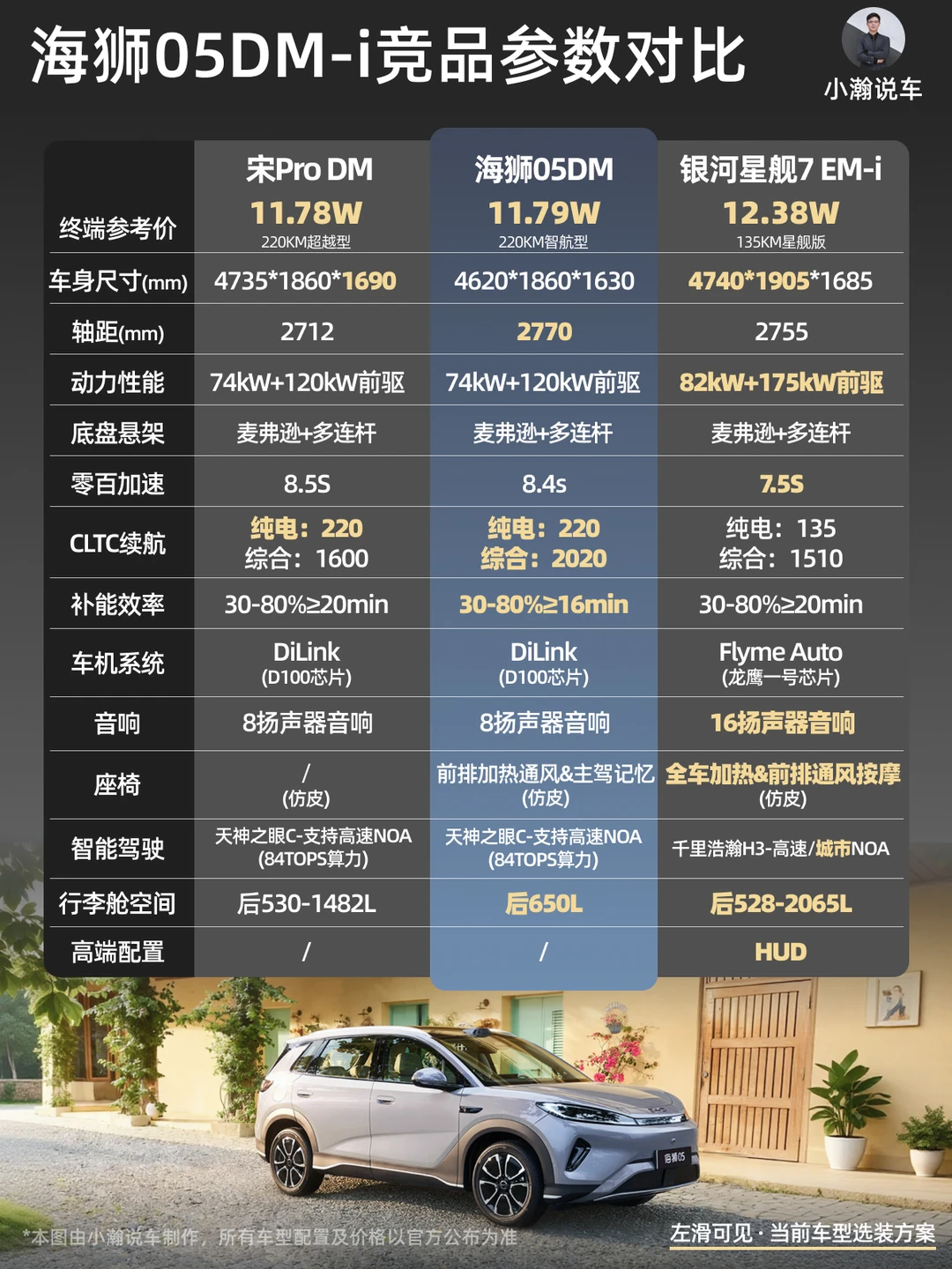 海狮05DM-i无疑是9-12万级插混SUV里的稳妥之选。同配置下价格门槛比自家宋PRO插混更低,虽然舒适配置等依然弱于老对手星舰7,但220km纯电续航能更大程度缓解用户的用电焦虑。