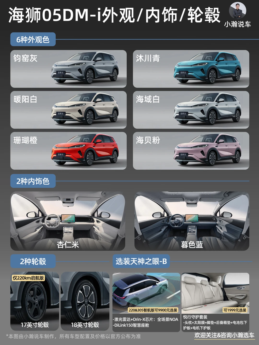 比亚迪全新海狮05DM-i正式上市,指导价9.79-12.79万元。全系可限时1999元购买悦行守护套装。除了低配的220启航版车型外的版本赠送7kW充电桩。220/305智航版两个版本可以9900元选装天神之眼B