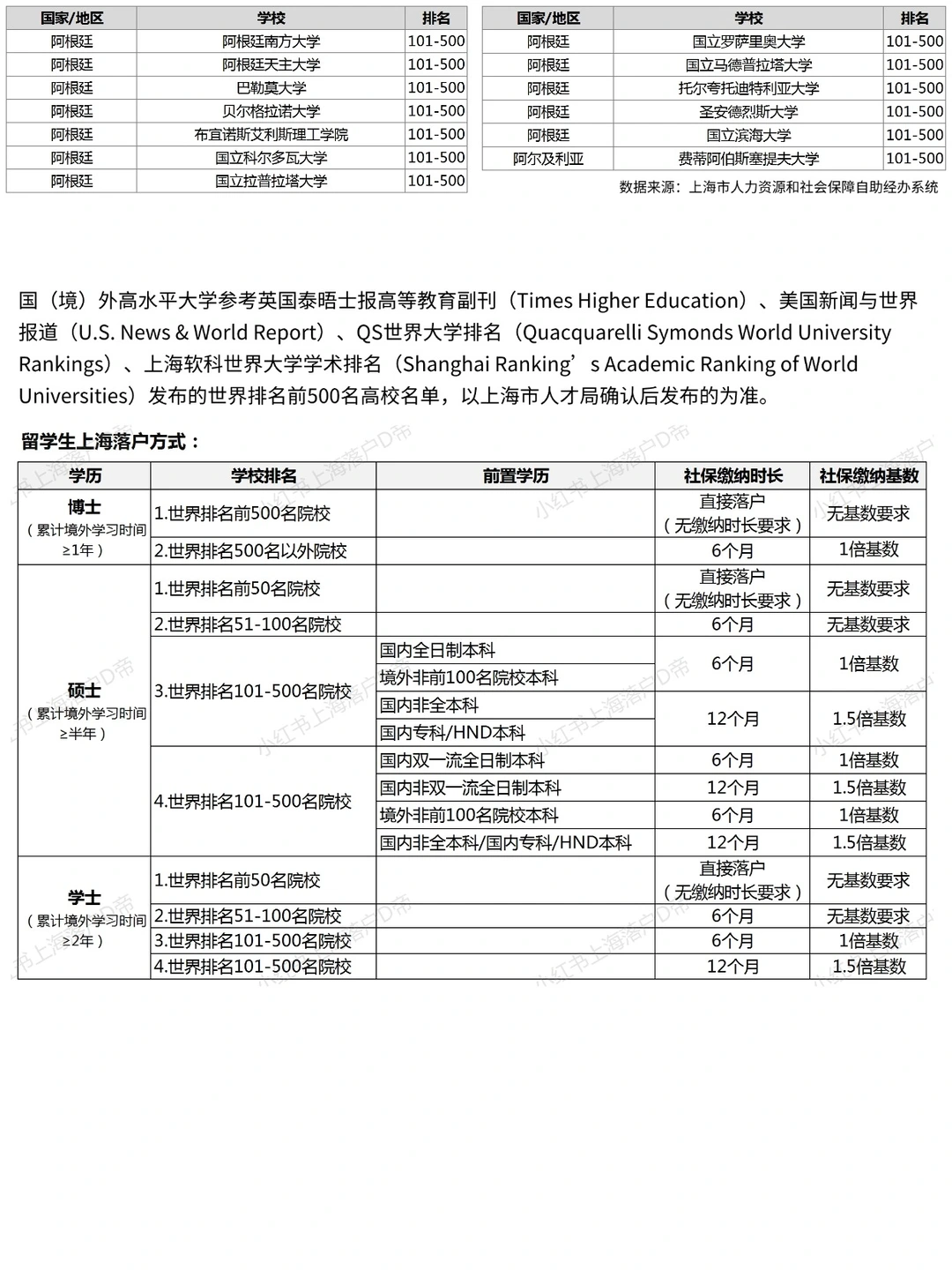 国(境)外高水平大学参考英国泰晤士报高等教育副刊(Times Higher Education)、美国新闻与世界报道(U.S. News & World Report)、QS世界大学排名(Quacquarelli Symonds World University Rankings)、上海软科世界大学学术排名(Shanghai Ranking’s Academic Ranking of World Universities)发布的世界排名前500名高校名单,以市人才局确认后发布的为准。