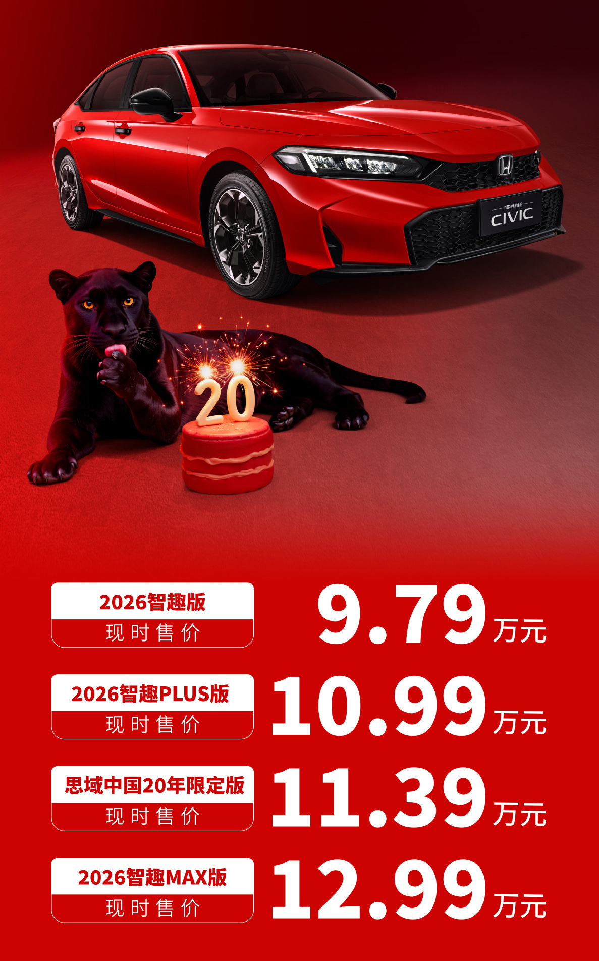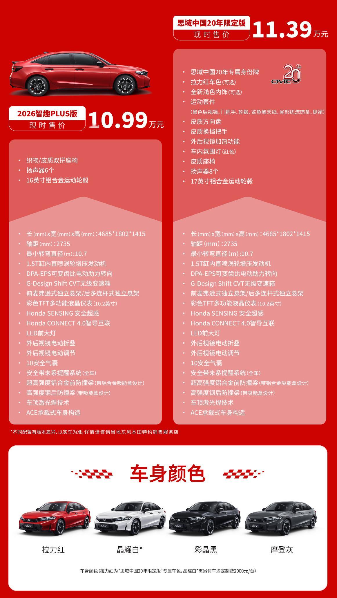 今天 思域 2026款上市,其中包括「思域中国20年限定版」。售价9.79万的入门车型除了配置比较低之外,发动机还是低功率版,只有129马力,其余3款车型都是182马力的高功率版1.5T,所以综合起来还是10.99万的“智趣PLUS版”性价比最高,LED大灯、L2级辅助驾驶等都齐全了。