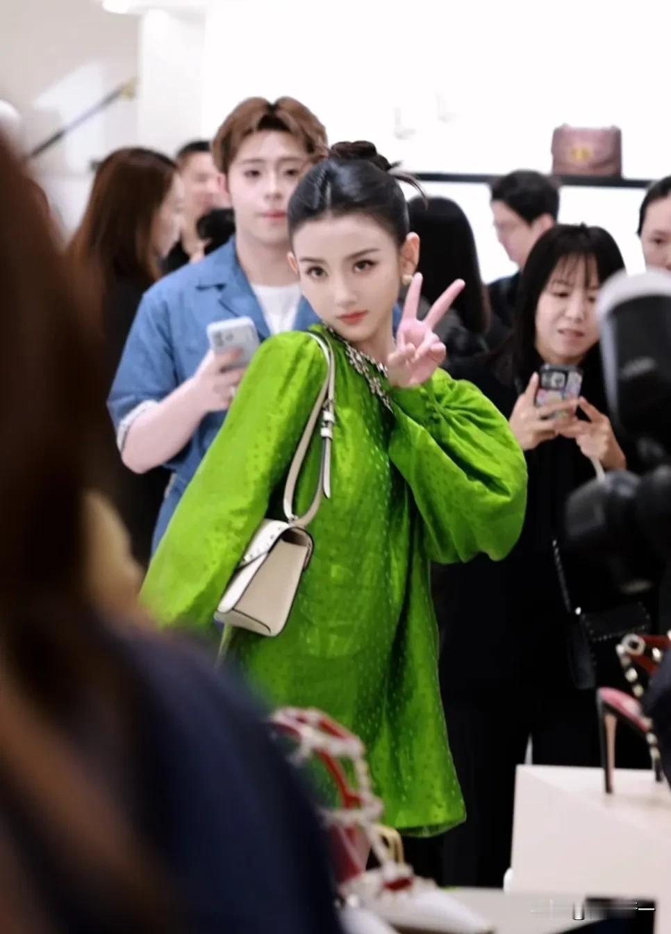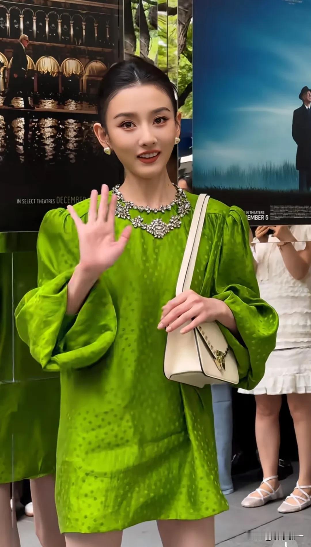 4月22日她出席华伦天奴活动,将一套“显老气”的绿色短裙都衬得可爱美艳,精致长相还有几分似张柏芝,和大美人一样的脸,明明作品也不少。