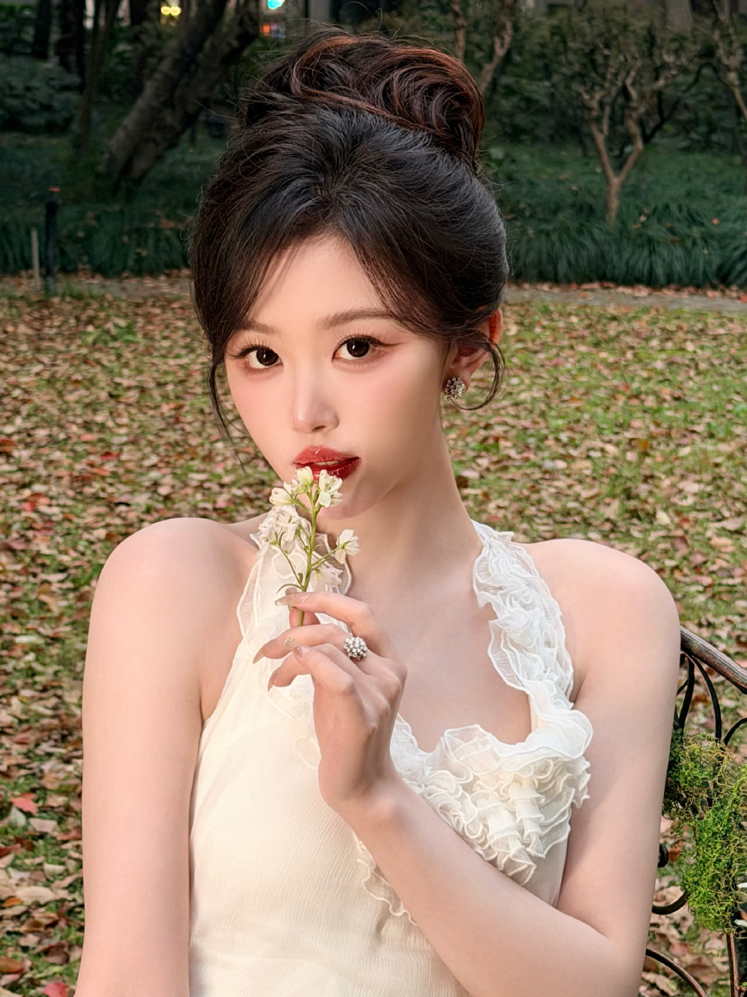 黑蕾丝轻垂,露肩含笑,温柔在光影里静绽。