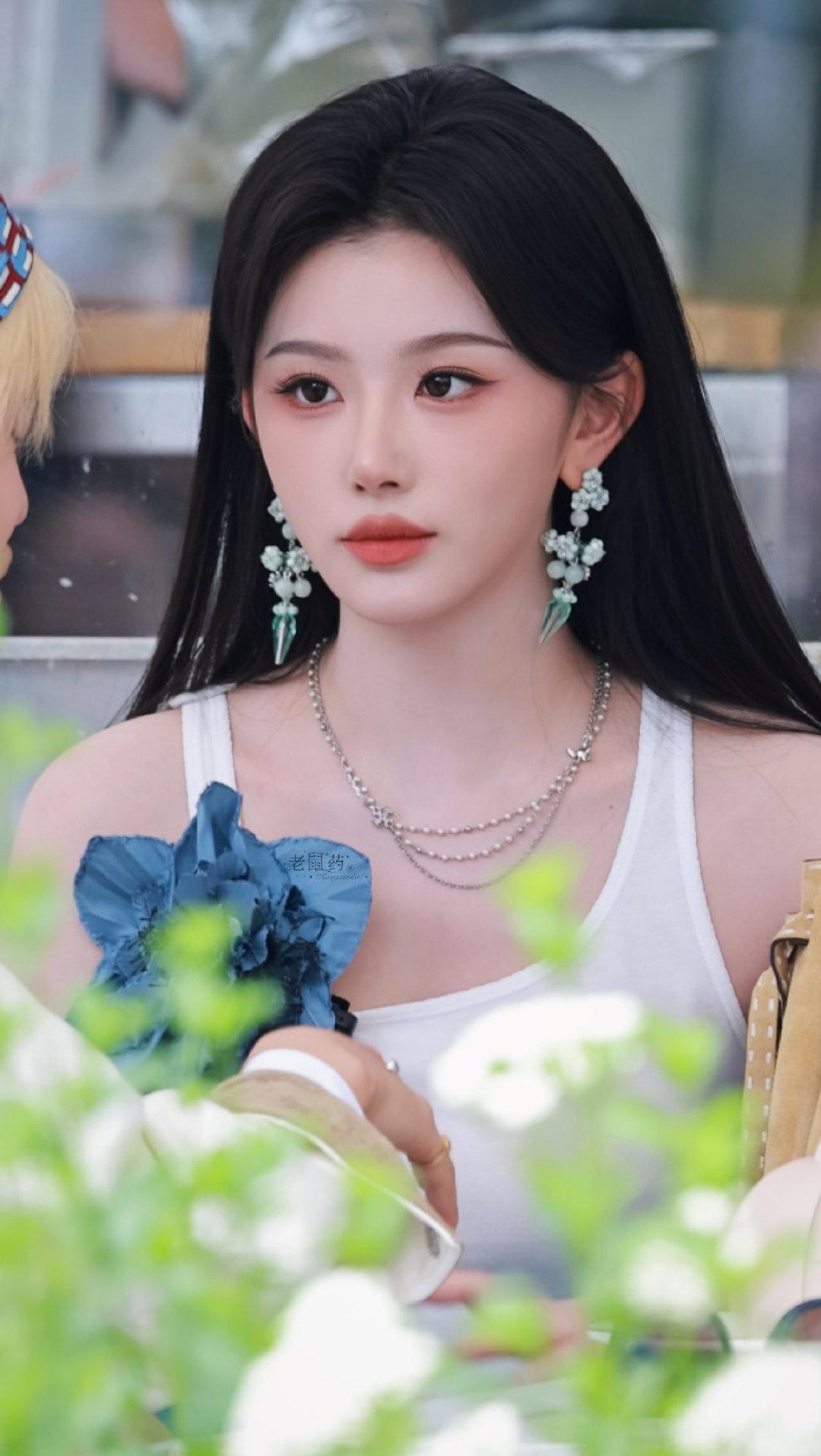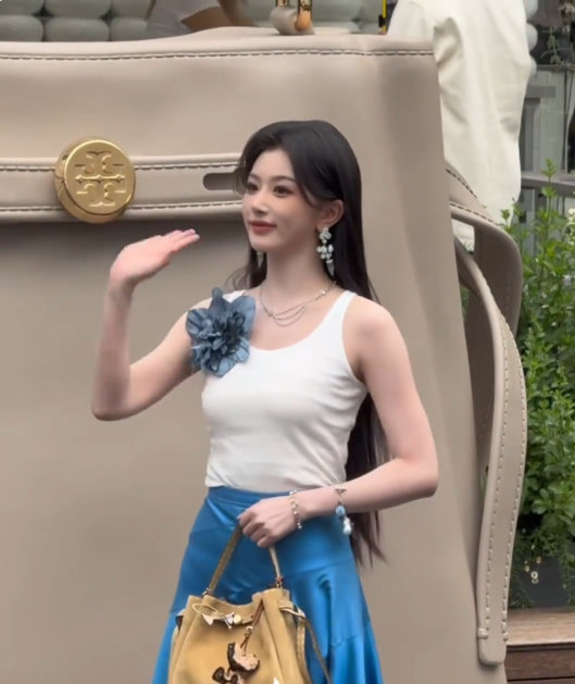 孔雪儿穿老头背心都这么漂亮的女人 清冷风和少女感原来可以共存!白背心的随性+花边蓝裙的柔美+黑长直的气质,孔雪儿今日线下活动造型我给满分,路人抓拍都封神~