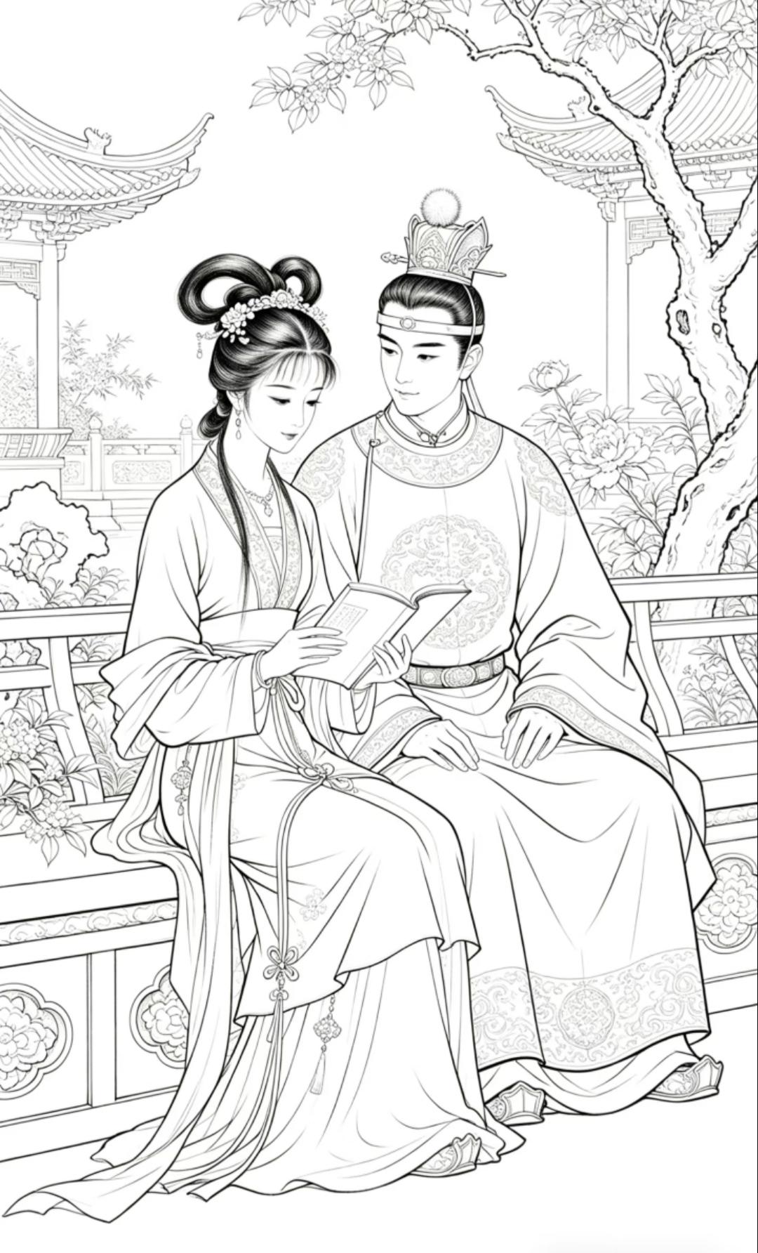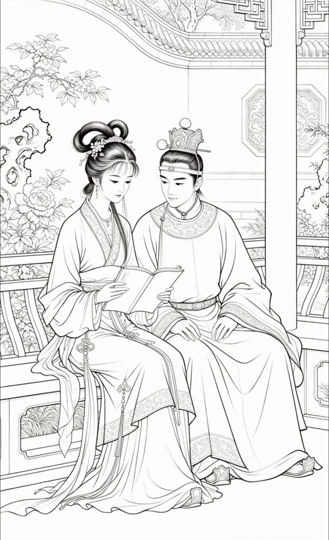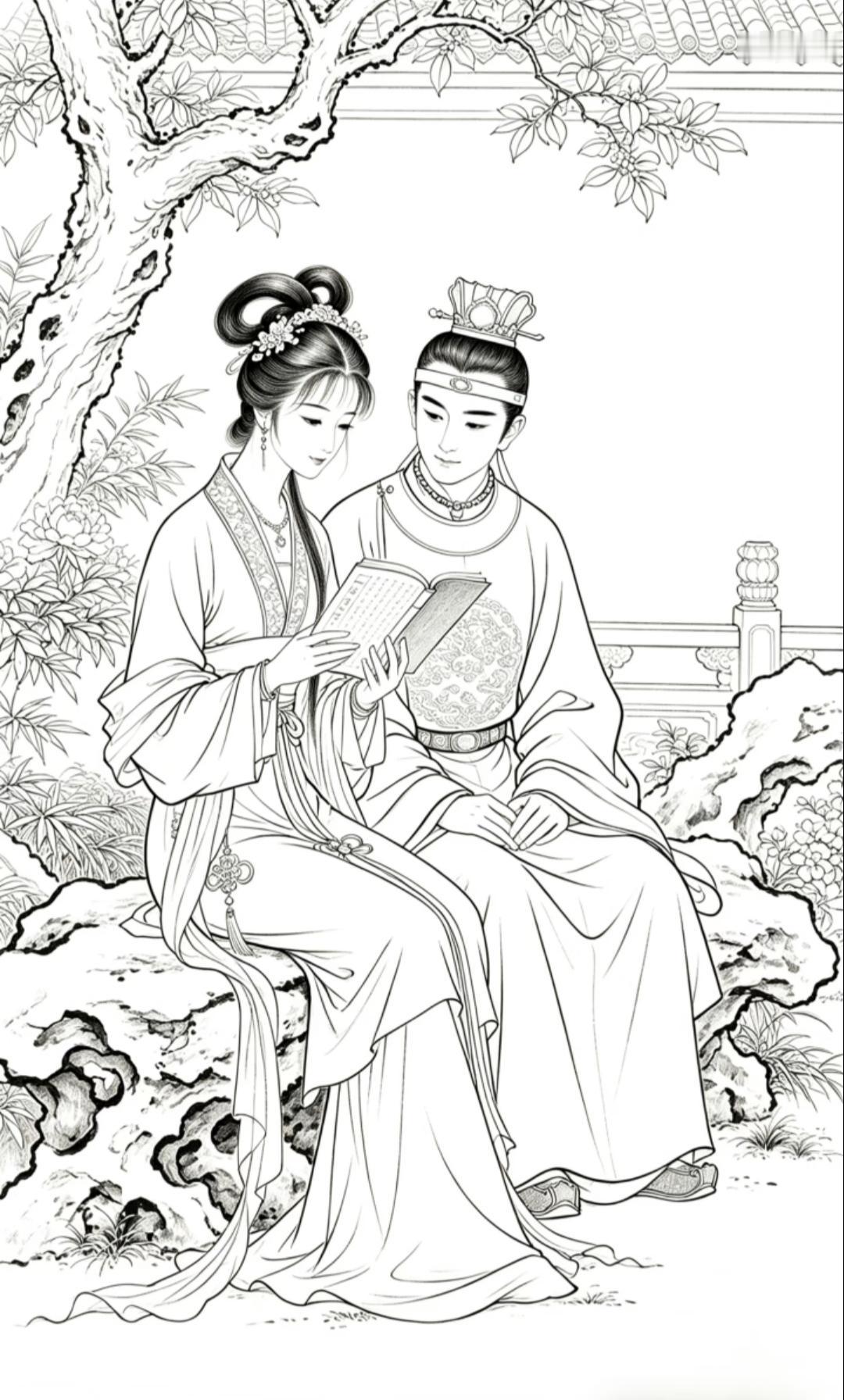 素材|宝黛共读西厢(线稿图) 春日生活打卡季 绘画