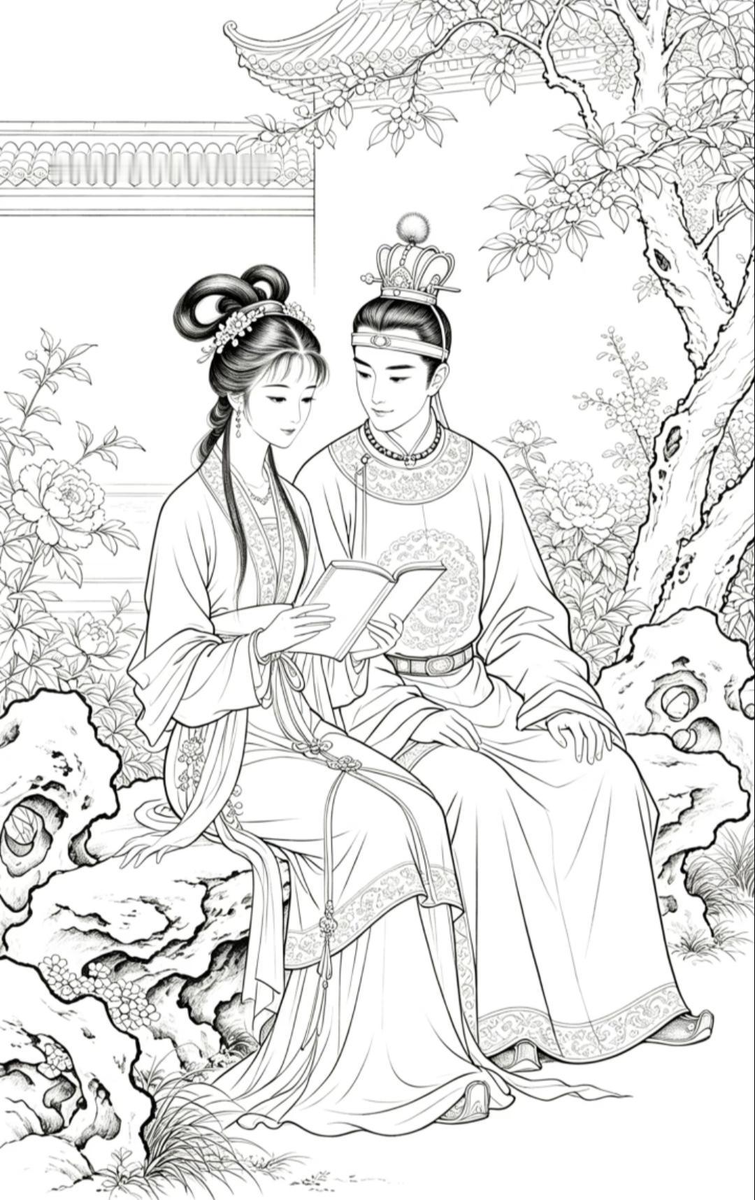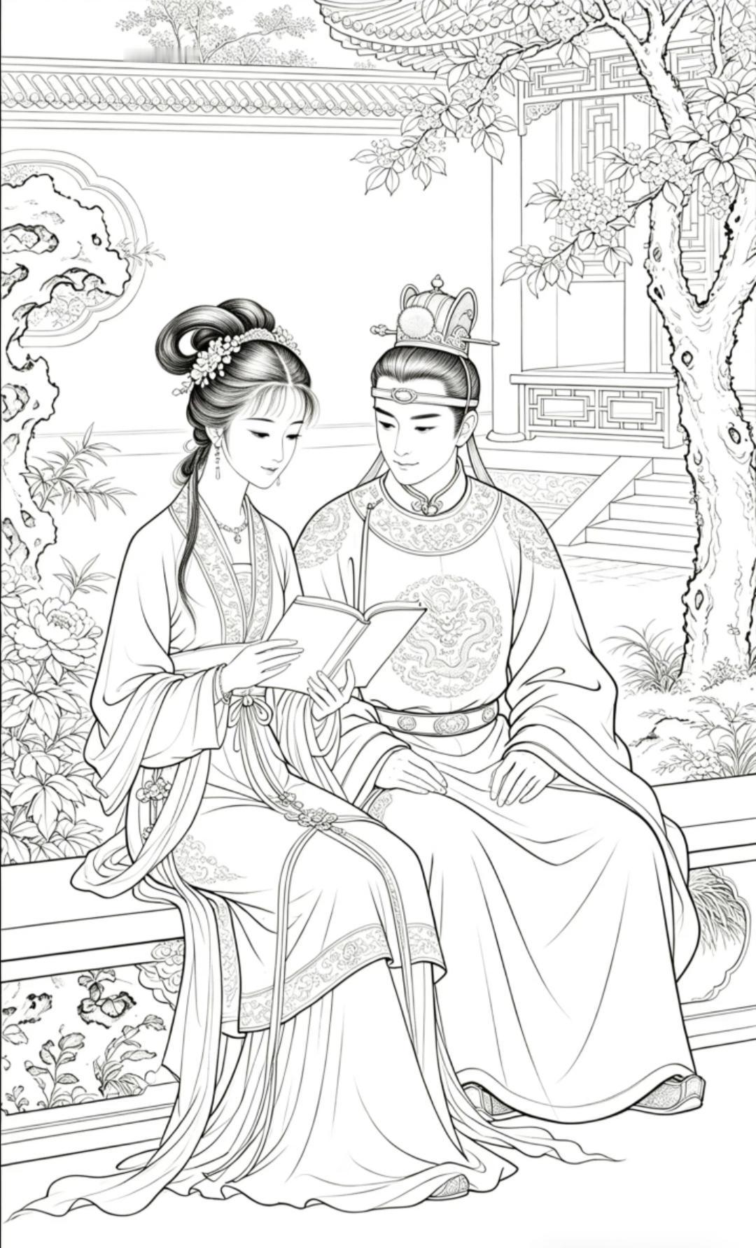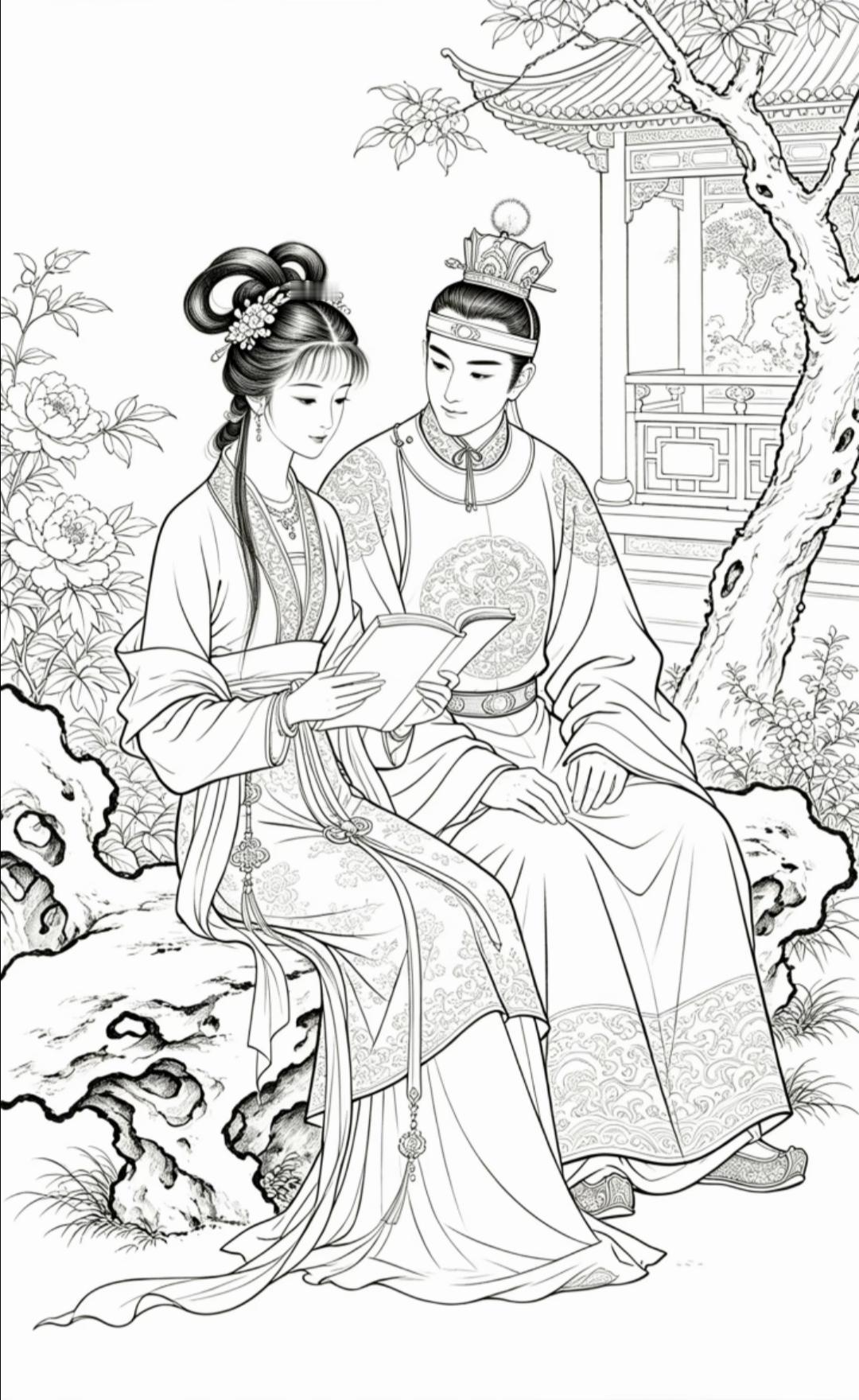 素材|宝黛共读西厢(线稿图) 春日生活打卡季 绘画