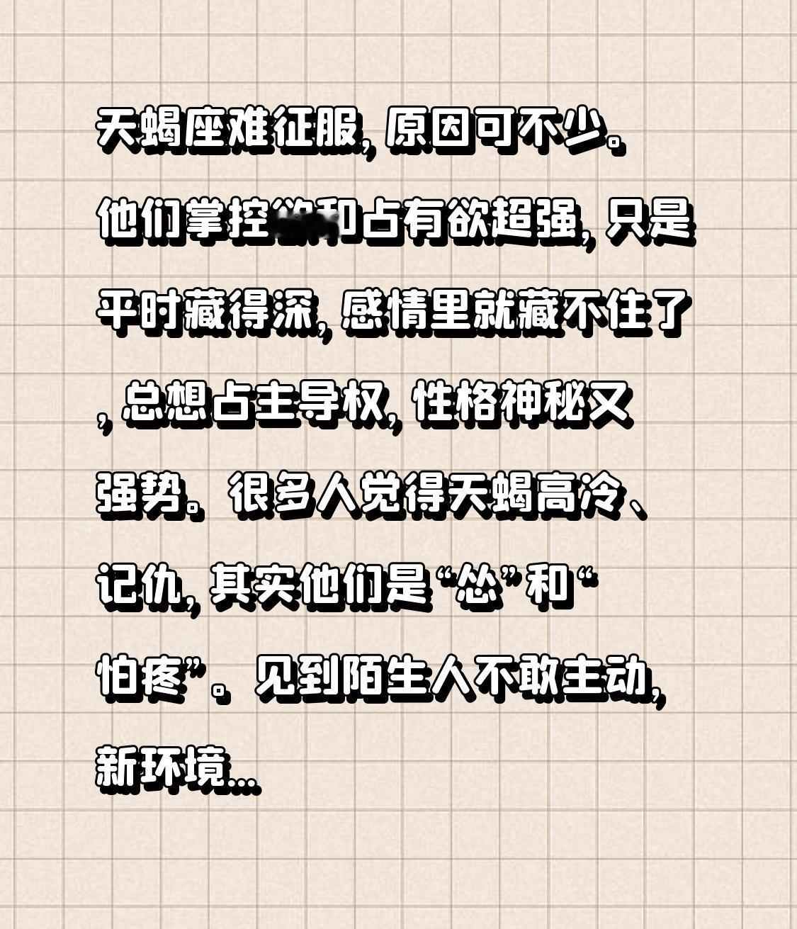 很多人觉得天蝎高冷、记仇,其实他们是“怂”和“怕疼”。见到陌生人不敢主动,新环境先躲角落,喜欢人也不敢表现,因为怕受伤。他们一旦热情起来就掏心掏肺,所以得先确认对方不会伤害自己。要是不小心伤了他们,他们会记很久,因为爱得深,伤得也深。想征服天蝎,得保持绝对真诚,不搞套路,还要有强大实力,等通过他们的考验,幸福就来了。