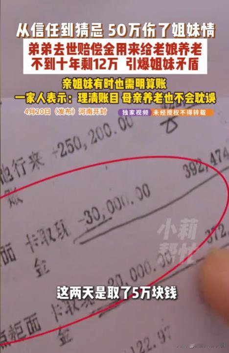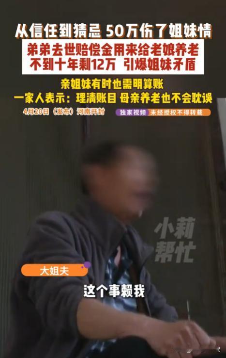 河南开封,一82岁老妇痛失小儿子后,获得了近50万元的赔偿款。5个女儿决定把这些钱留给老妇养老,并由大姐保管。可谁能想到,10年后当老妇需要手术费时,卡里竟只剩下12万元了。面对几个妹妹的质疑,大姐气得直言以后不再管老妇的死活,还要和4个妹妹断绝关系。大姐夫则表示对得起自己的良心,也未曾亏待过老妇。
