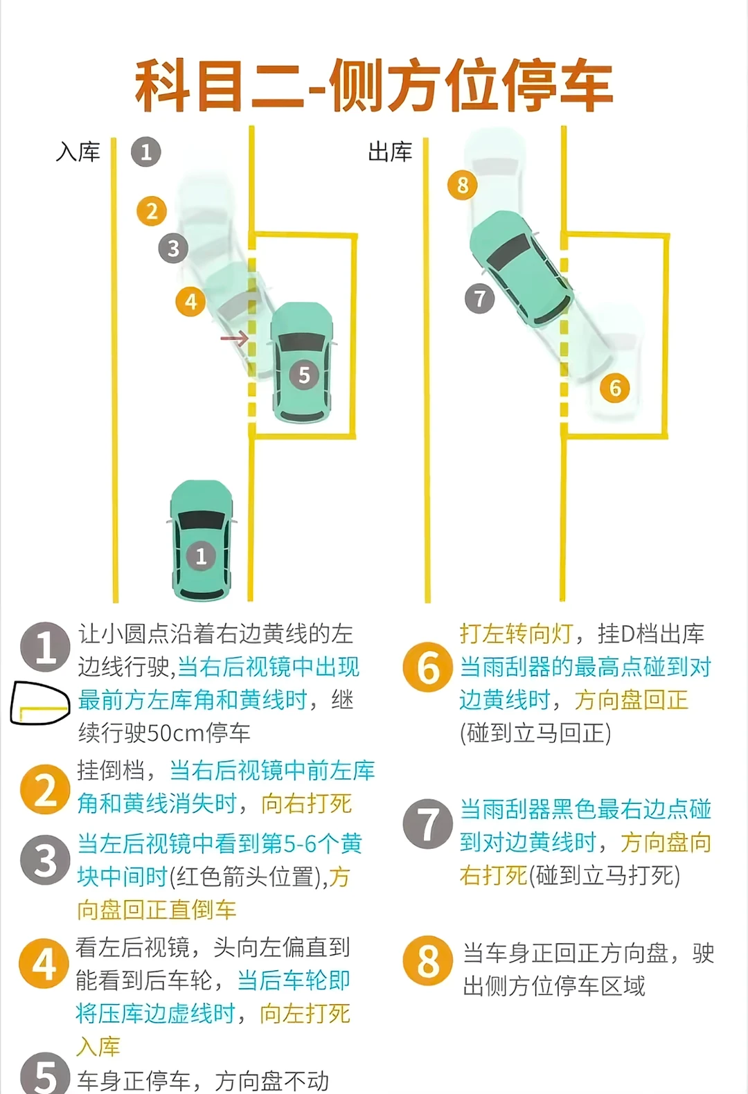 4.侧方位停车停车:3步停车,对我的难点是最后一步,找好车轮即将压线点很重要