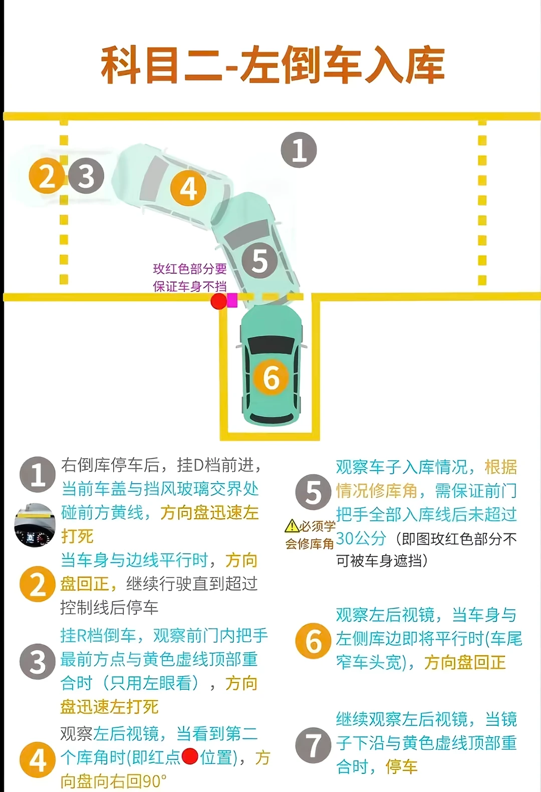 左倒库:点位很少,掌握右倒车入库后再学习基本没啥问题