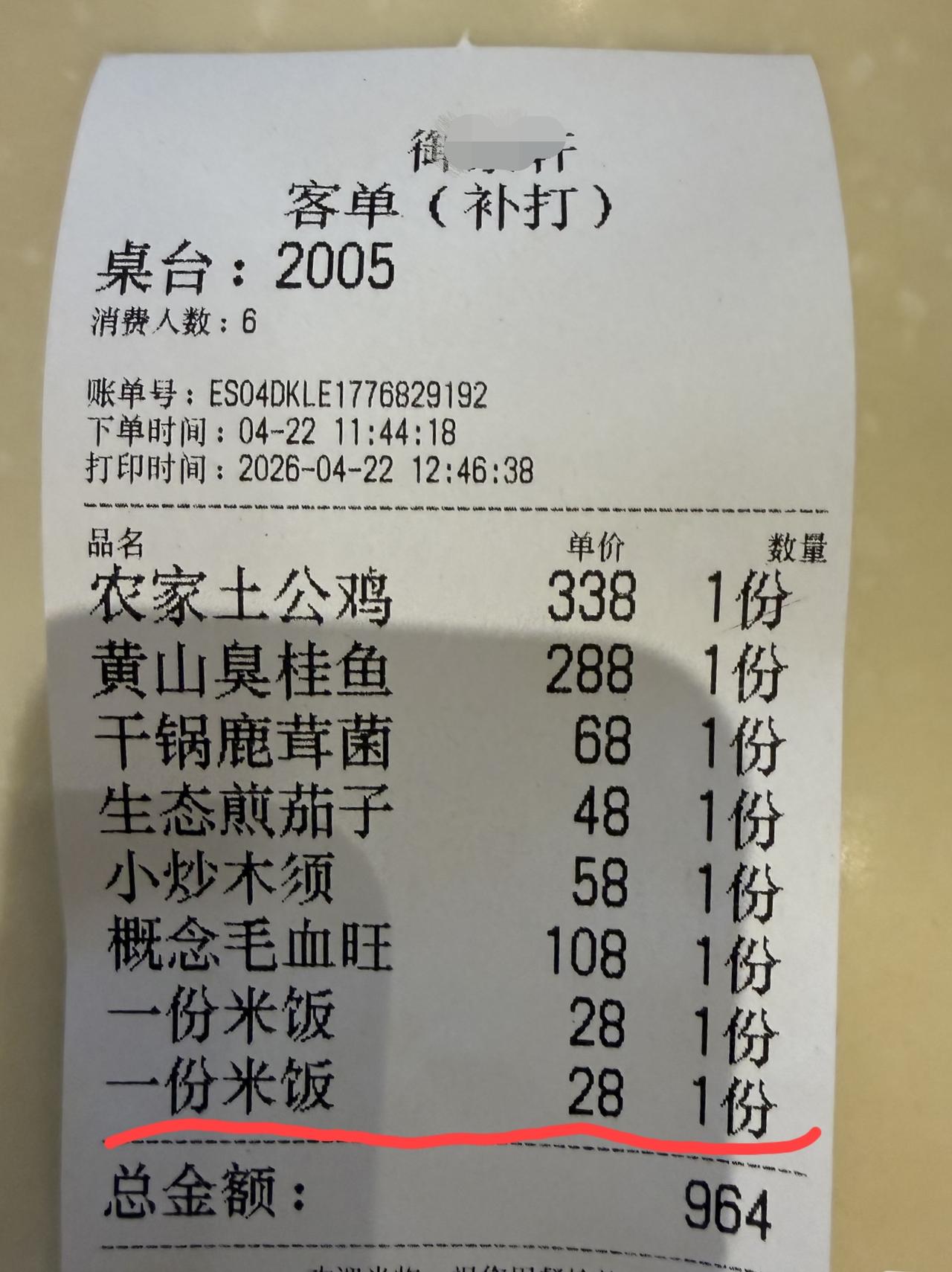 4月22日,安徽淮南。网友发文吐槽:这家酒店太坑人了,臭鳜鱼点菜时还是188一份,买单时却出现了阴阳菜单,要288。其他菜也都是涨了三四十一份。最夸张的大米饭,28元一份……