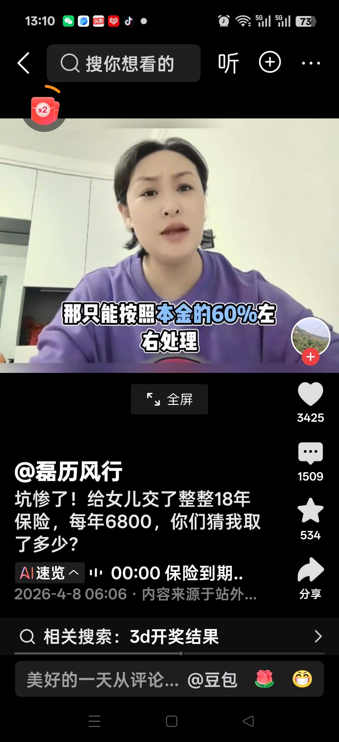 坑惨了,给女儿交了整整18年的保险每年6800,你们猜我取多少?保险公司经理对我说:可能和你当初预想的不太一样,没有多少利息和分红,要到孩子60岁才能领取。如果你要坚持退,那只能按本金的60%给你处理。有的人说:购买的是平安保险,把我坑的要死在保险公司,他们报警了,警察让平安领导来了,领导说退我全款,部门经理不同意扣我8000,为这个事拖我了十个月,我实在是拖不起很无奈的退了,保险公司就是骗子!有的人说:购买的新华保险的分红型保险,共交20年。今年4月9号到期,4月10号直接用手机领取十分到账,这要看你买的险种是哪一种?今年我又买了一种。有的人说:除了社保,其他的保险都不要买,大家说是这样的吗?