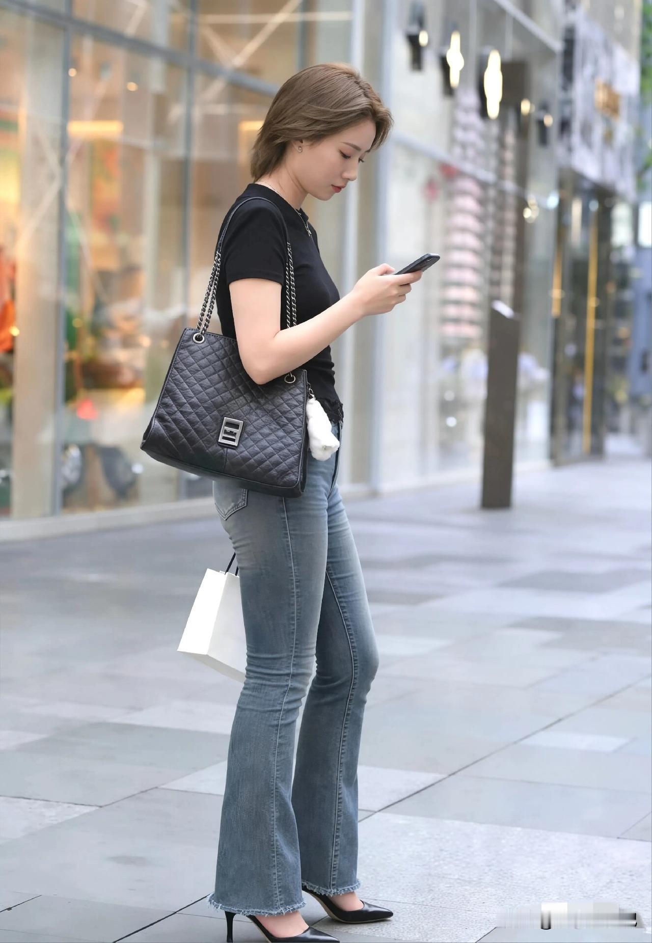 黑T恤+微喇裤,梨形身材的显瘦搭配