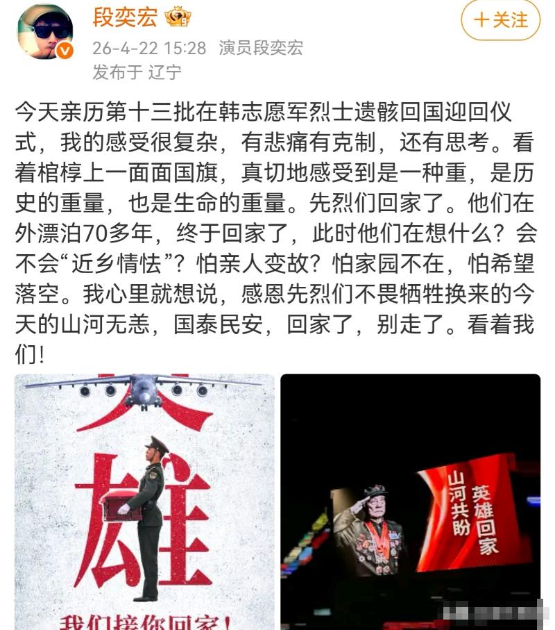 4月22号下午,段奕宏在个人社交账号上发了条动态,说自己亲历了第十三批在韩志愿军烈士遗骸回国的迎回仪式。
