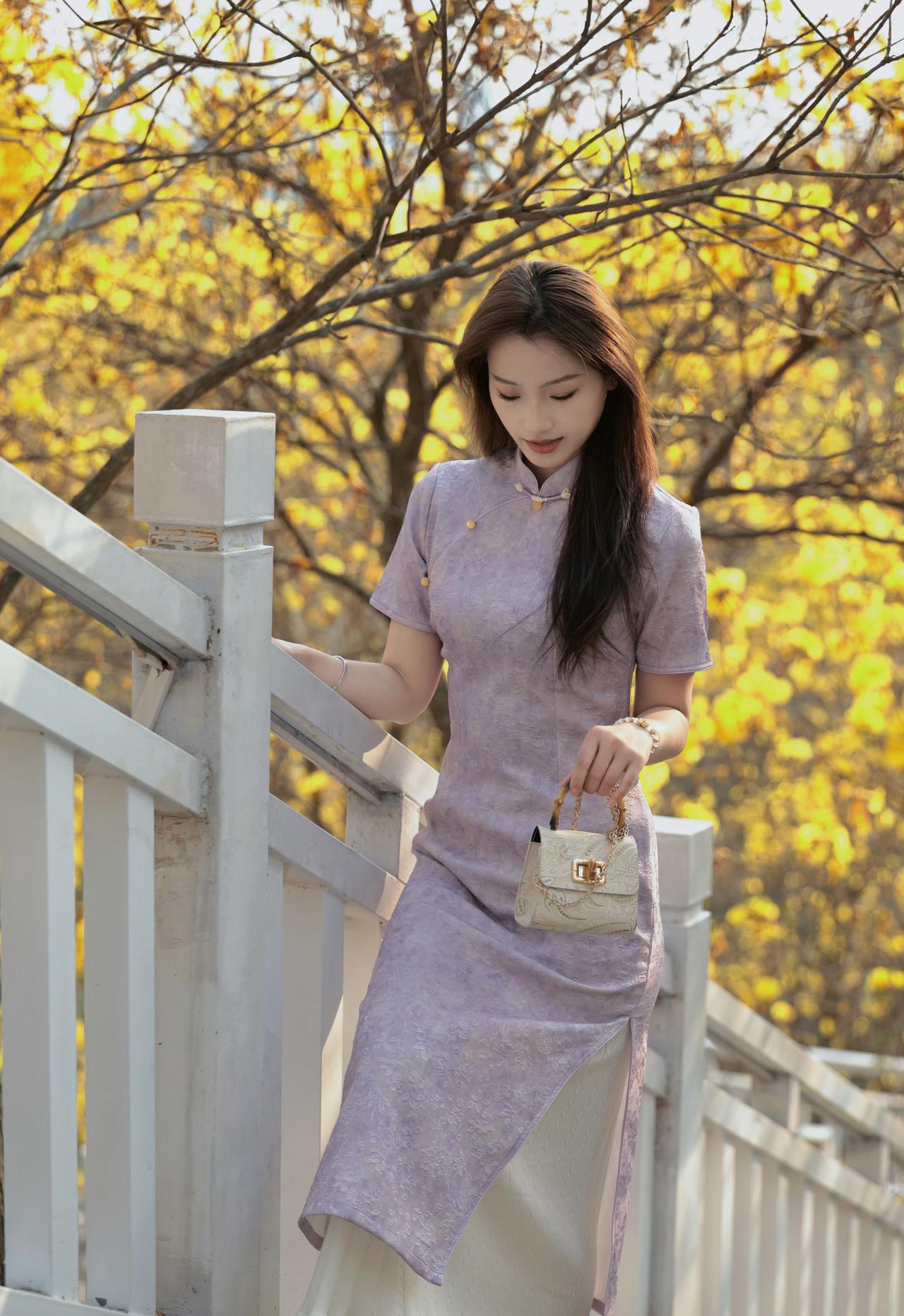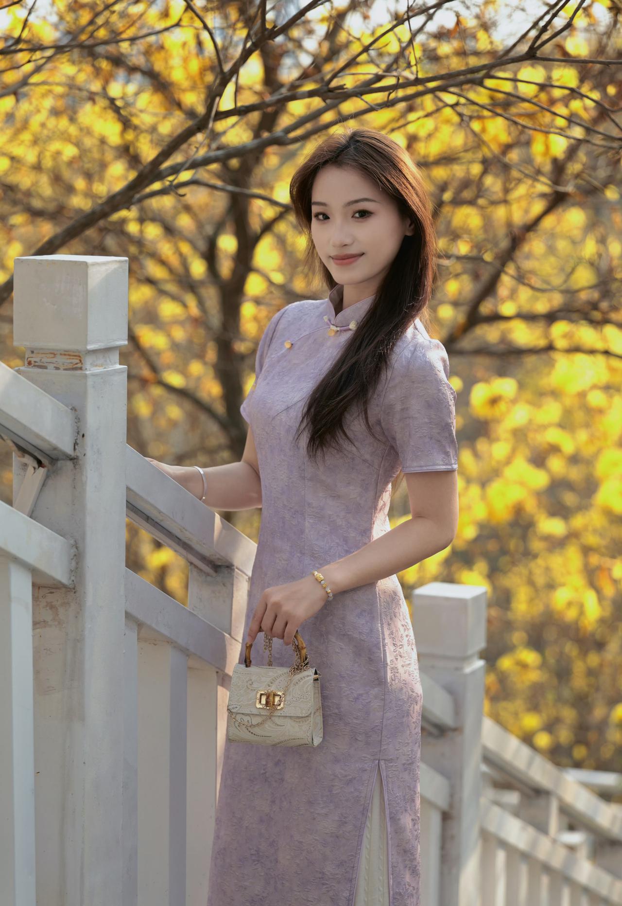 浅紫旗袍裹着温柔心事,落日把秋林晕成一片暖金。