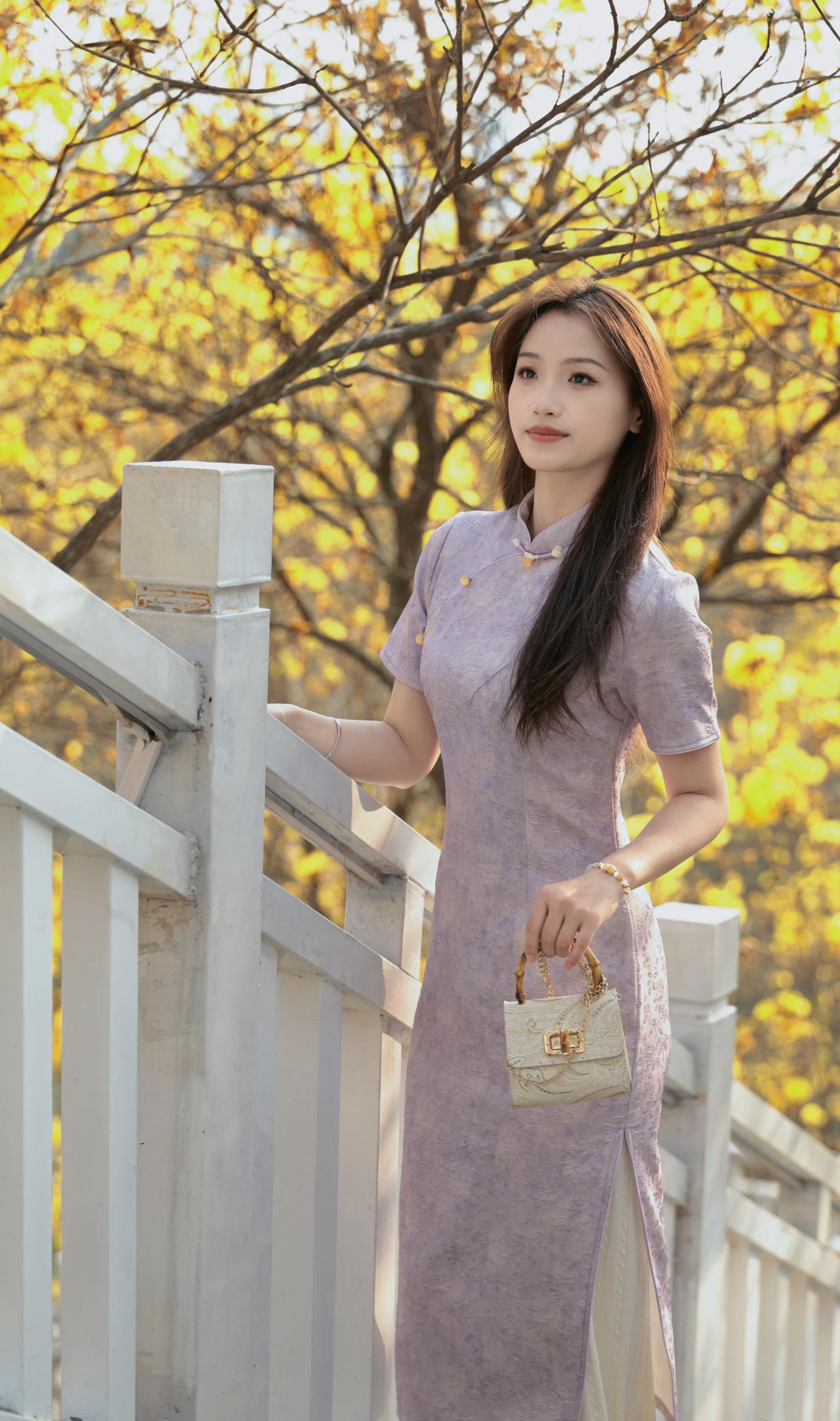浅紫旗袍裹着温柔心事,落日把秋林晕成一片暖金。 晚风漫过栏杆,时光也在此刻慢了下