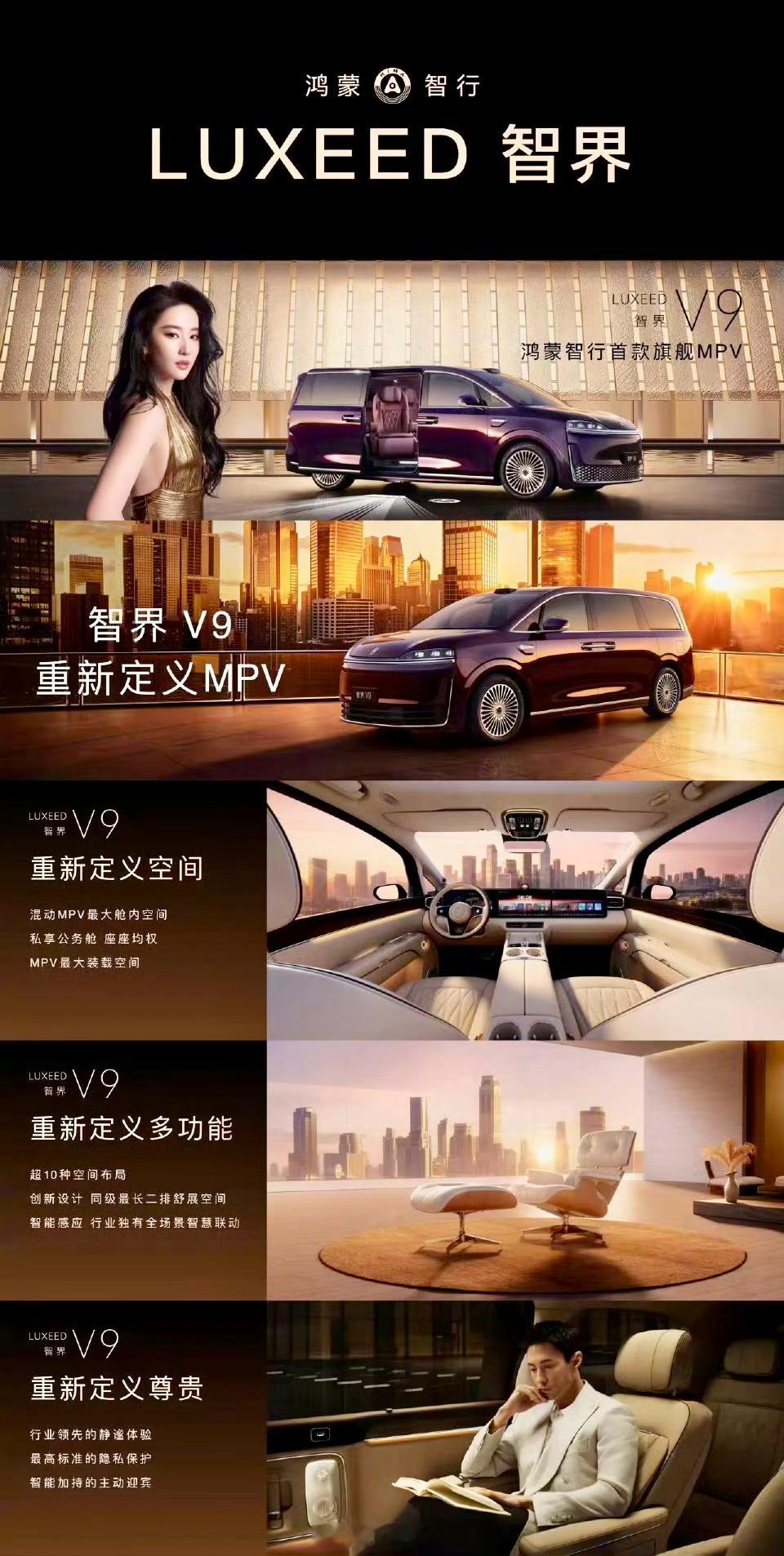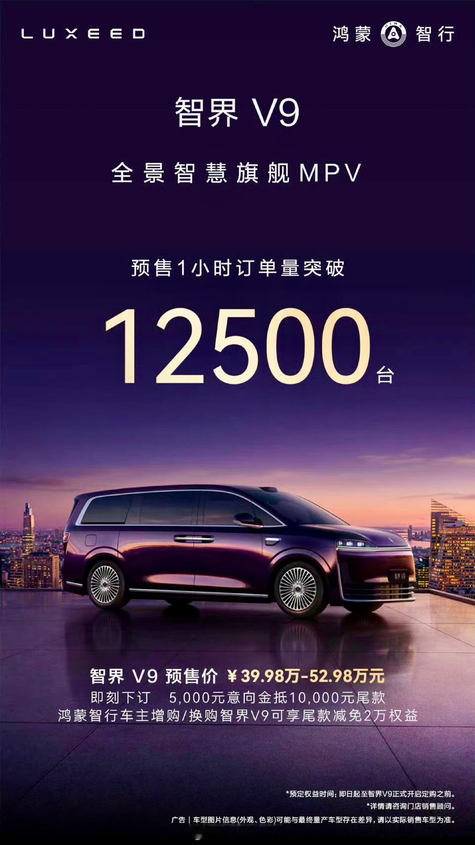智界V9 作为鸿蒙智行首款旗舰MPV,智界V9预售起步价39.98万元,预售1小时订单超12500台。