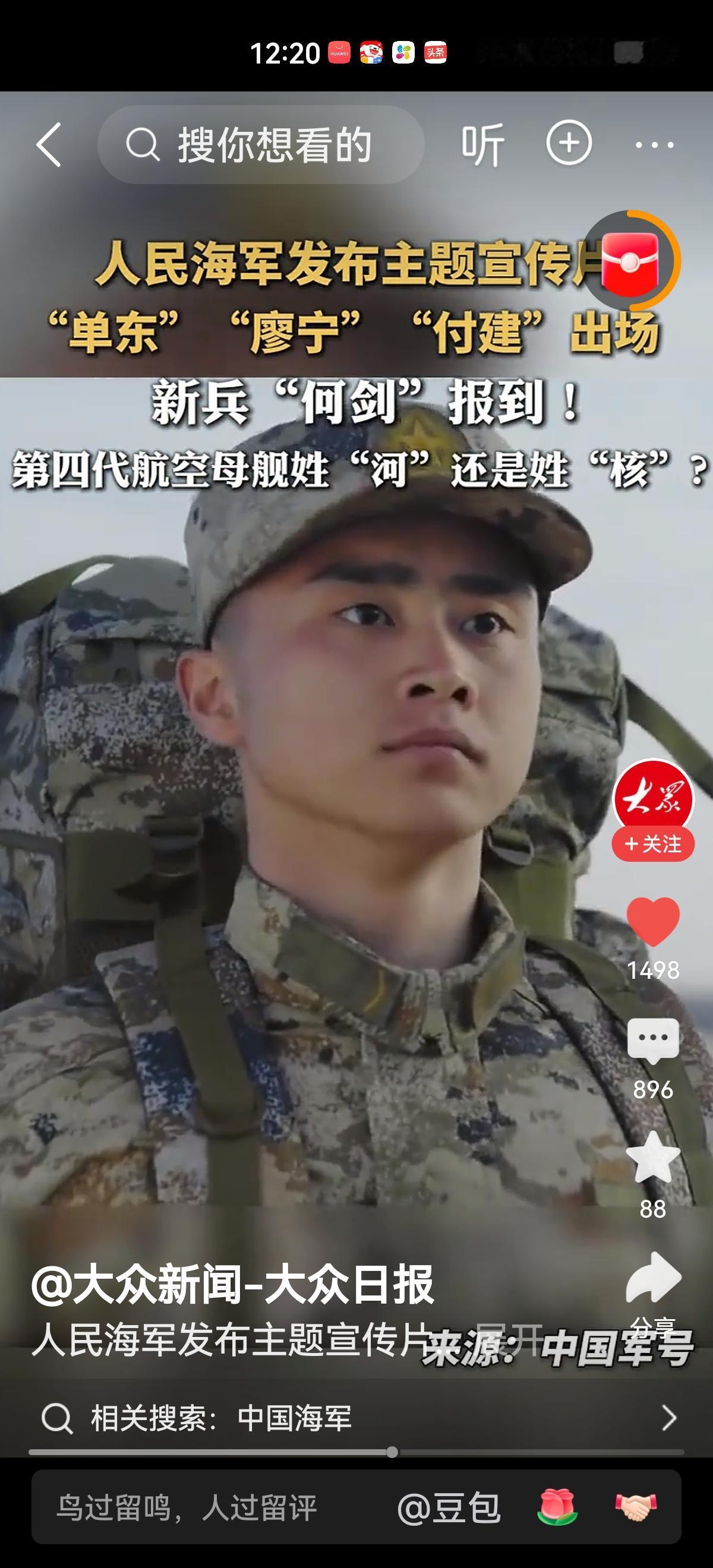 4月22日,人民海军发布主体宣传片《向大洋》,片中主人公的名字让全网沸腾了。片中廖宁、单东、付建显然是对应了辽宁舰、山东舰、福建舰,而19岁新兵何剑的报到,就让网友们不淡定了,这不就是第四艘航母吗!