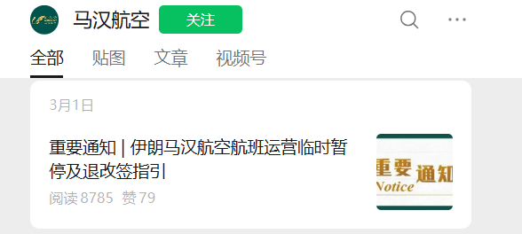 此前,本轮美以伊冲突爆发之后,伊朗马汉航空于3月1日宣布临时暂停所有往返伊朗的航班运营。