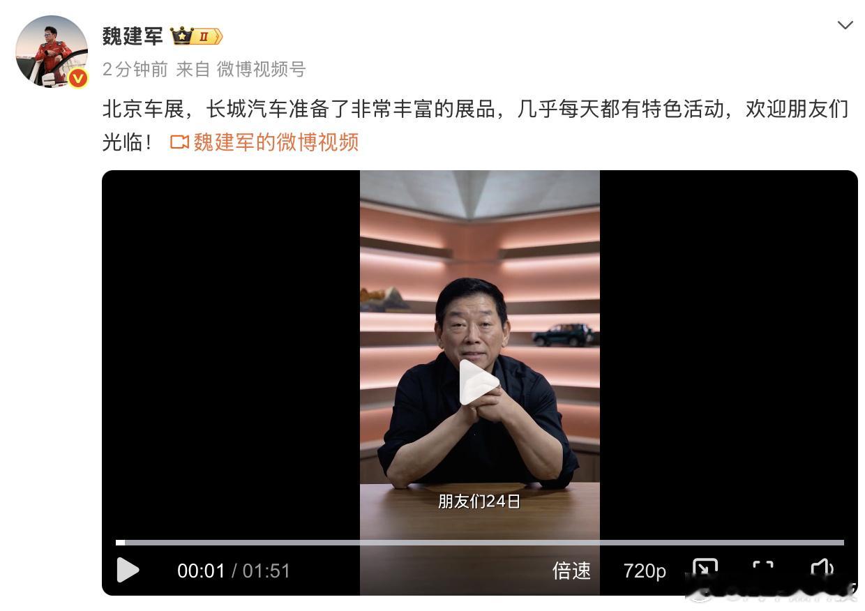 【魏建军自曝车展行程】4月23日,长城汽车董事长魏建军发布视频,预告了自己北京车展期间的行程。