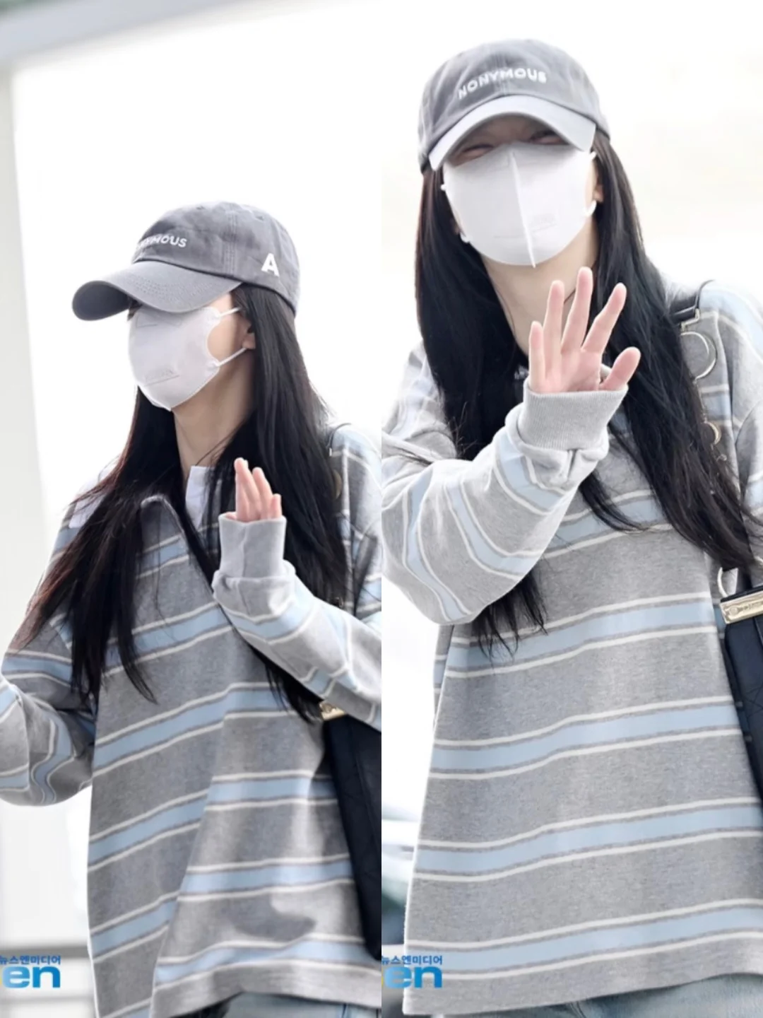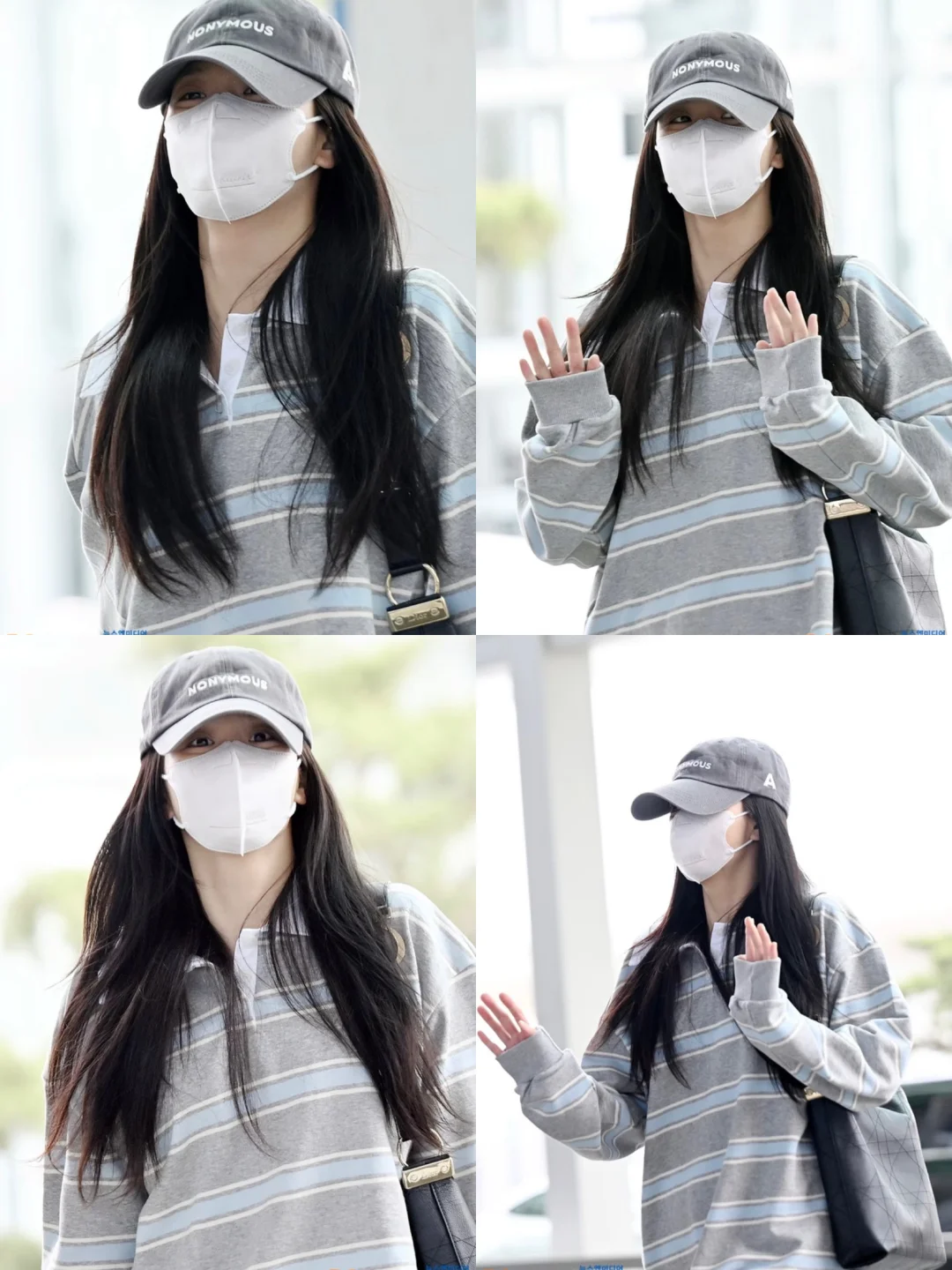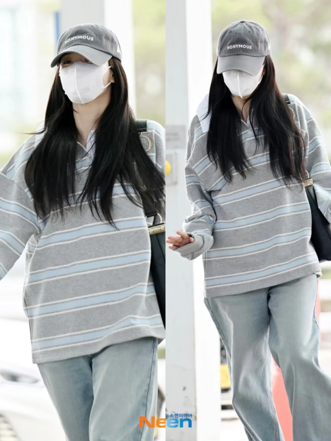 搭配浅蓝阔腿牛仔裤 + 灰色棒球帽,上下顺色极度舒适,整套都是低饱和度柔和配色,清冷温柔又低调