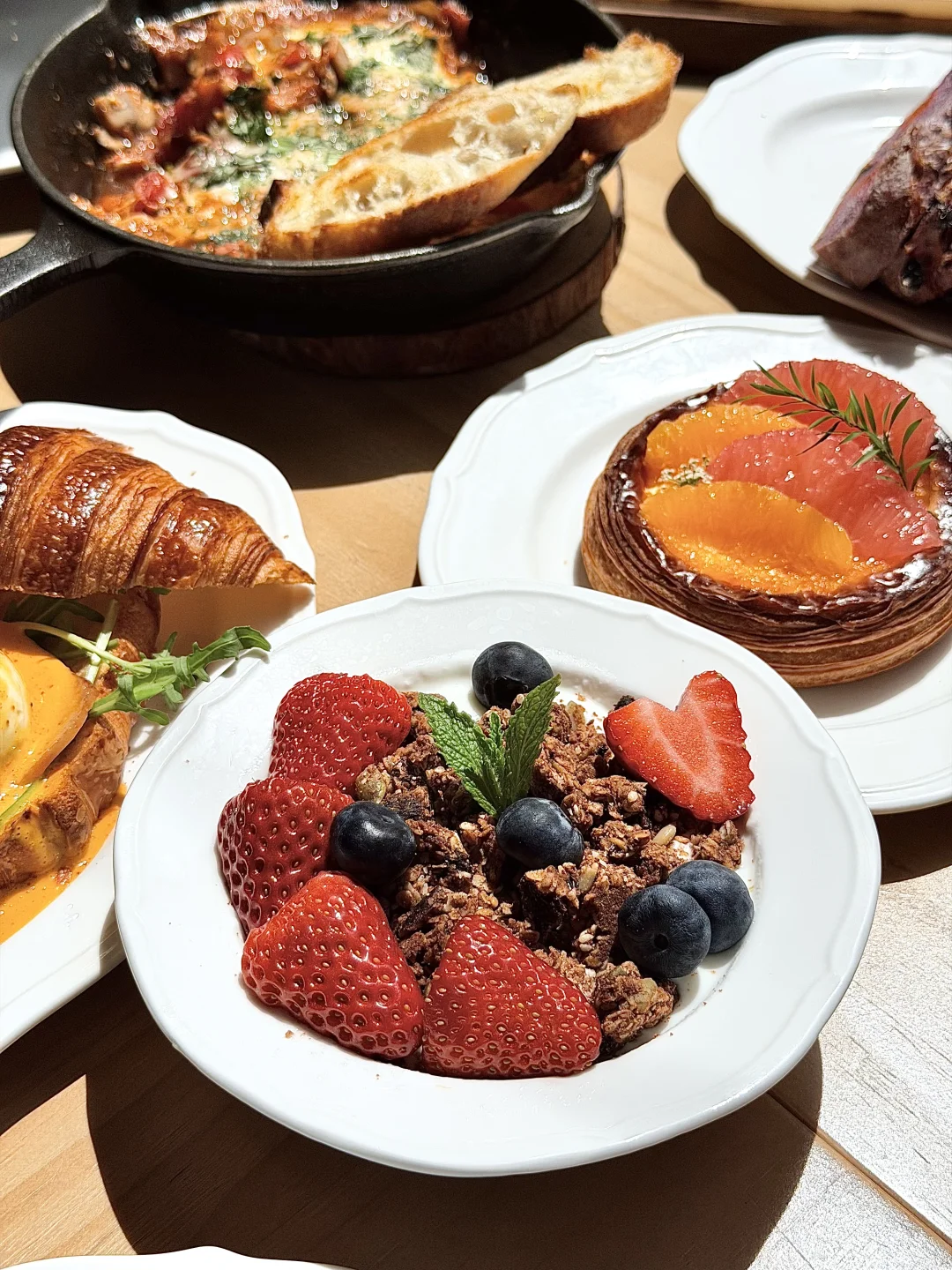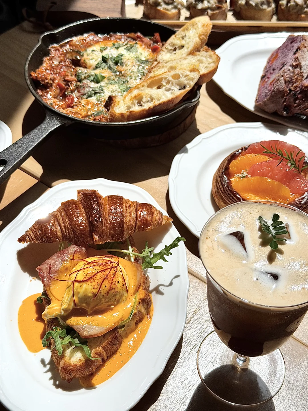 把可颂的酥皮、流心班尼迪克蛋、水果挞都镀上一层金边