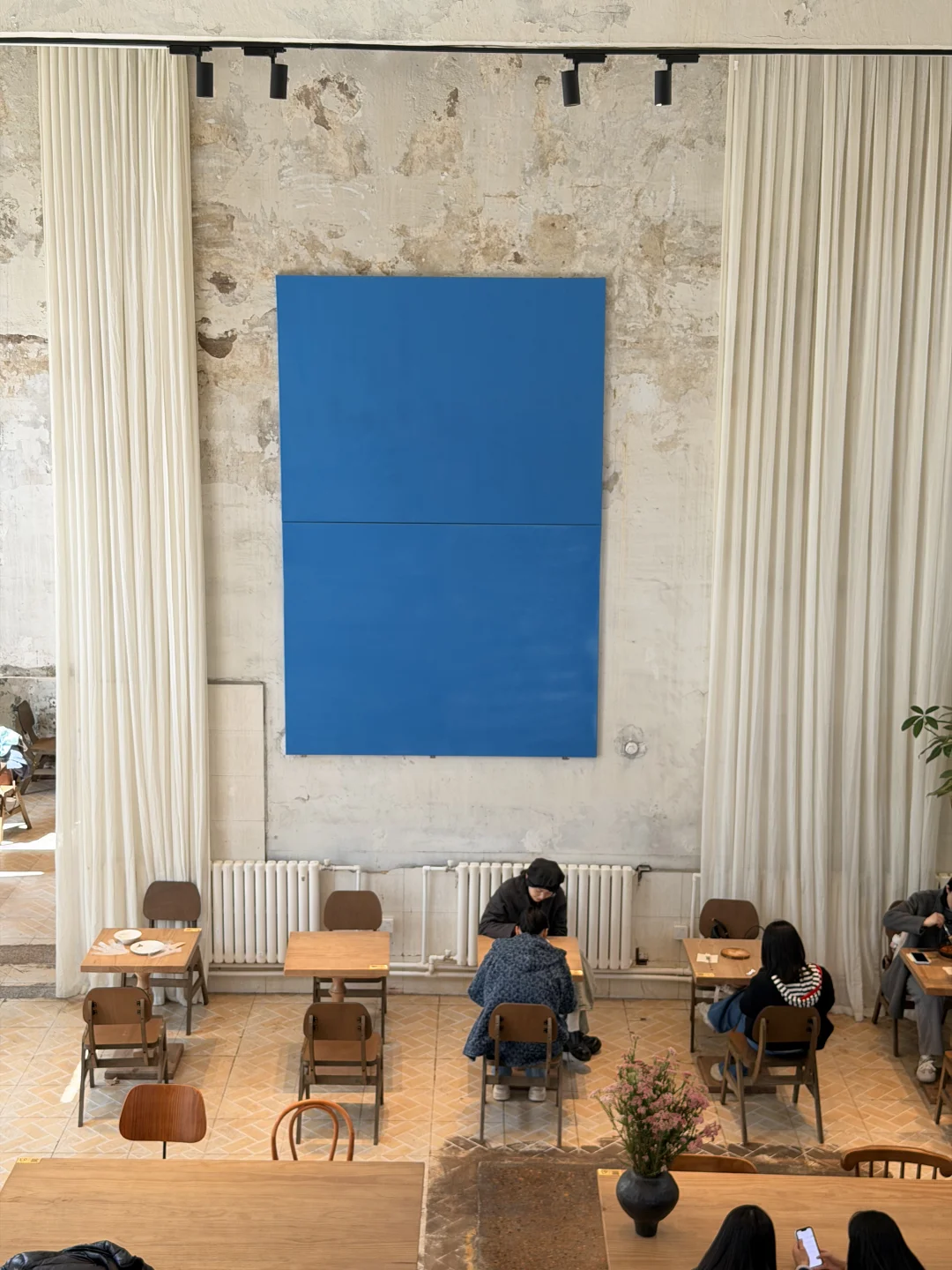 裸露的水泥墙、明亮的蓝色艺术画与面包食物的香气融合