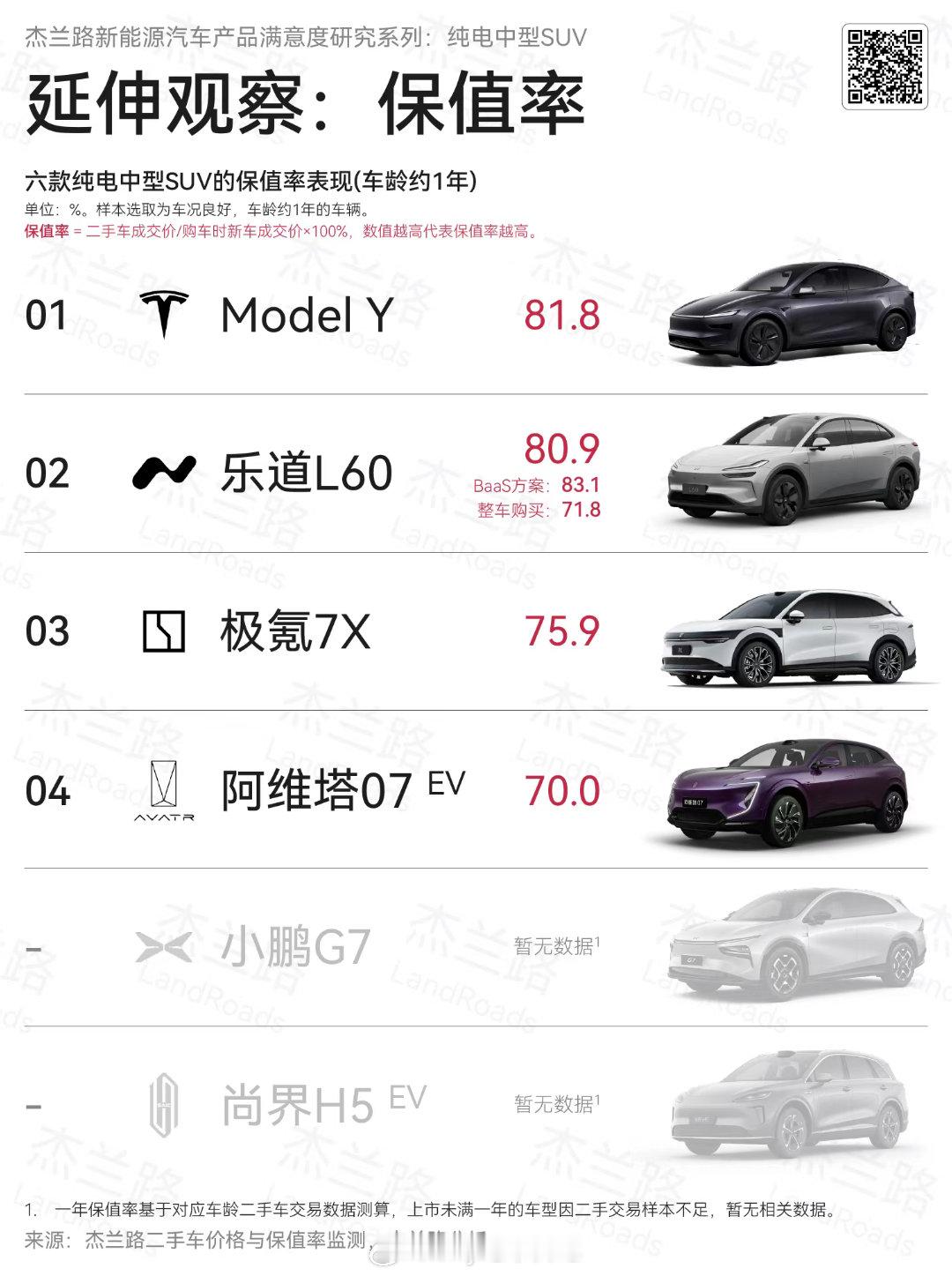 今天专业机构杰兰路最新公布的保值率榜单,在纯电中型SUV的保值率榜中,乐道L60仅次于ModelY排在第二位,一年保值率高达80.9!