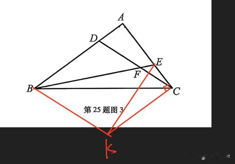 第25题.第三问.一个比较简单的逆等线.作角ECK等于90度且CK等于AC,连接EK.则三角形E C K全等于三角形D A C.这是用边角边进行判定的。所以EK等于AC等于DC。因为BD等于AC等于CK。则四边形BDKC为平行四边形。所以,DC平行且等于BK。又因为,DC等于EK。通过导角,角ECD等于角EKC。又因为角ECK等于90度。很容易证DC与EK垂直。所以,BK与EK也能垂直。三角形BKE为等腰直角三角形。BE等于根2倍的EK。BE等于根2倍的DC。为防止文字语言,同学们不好理解。我把图给大家画一下。