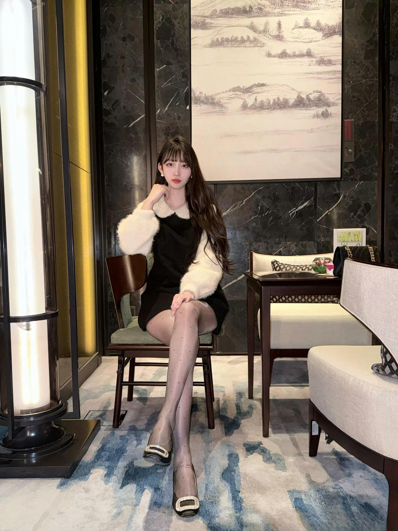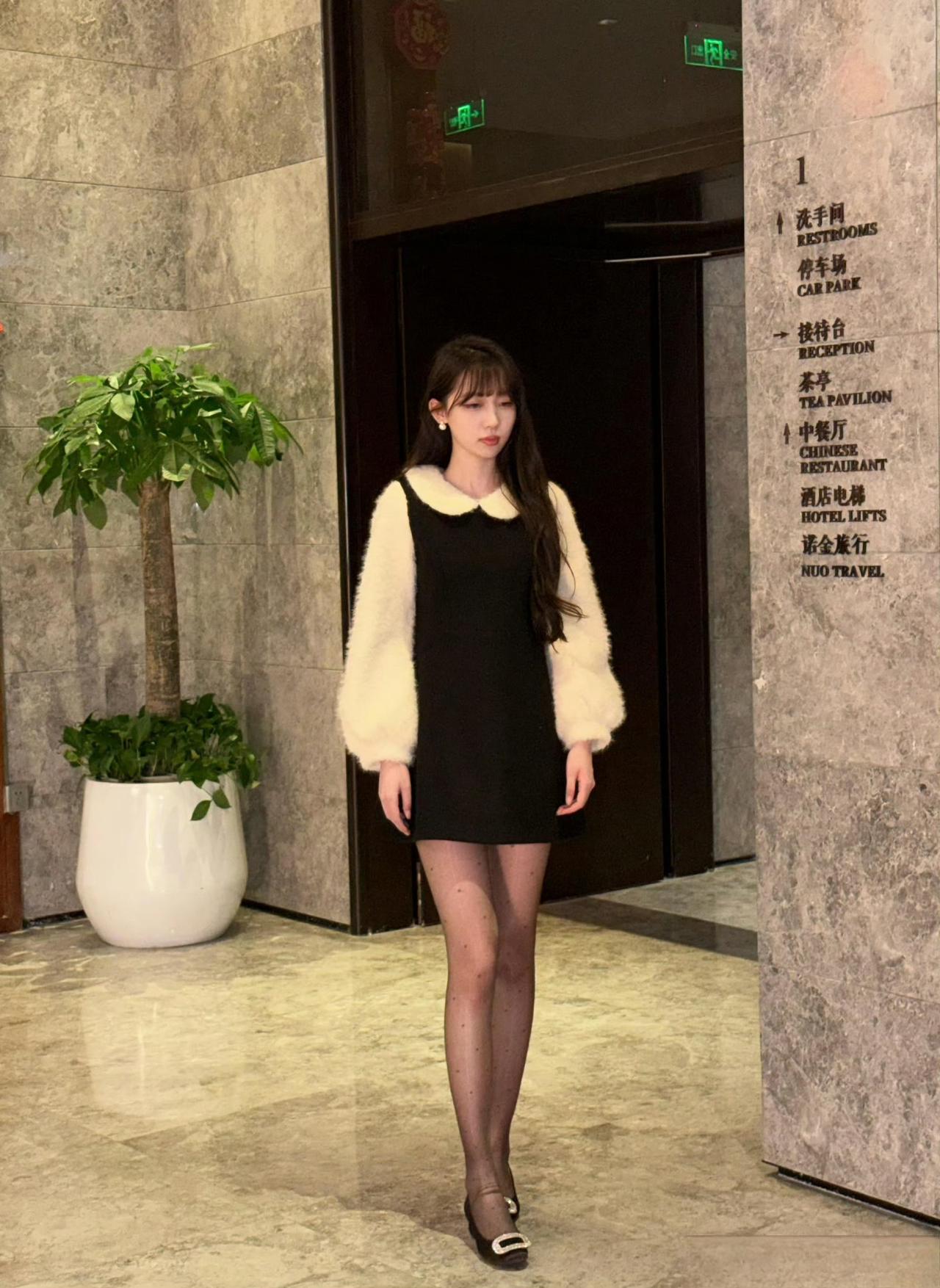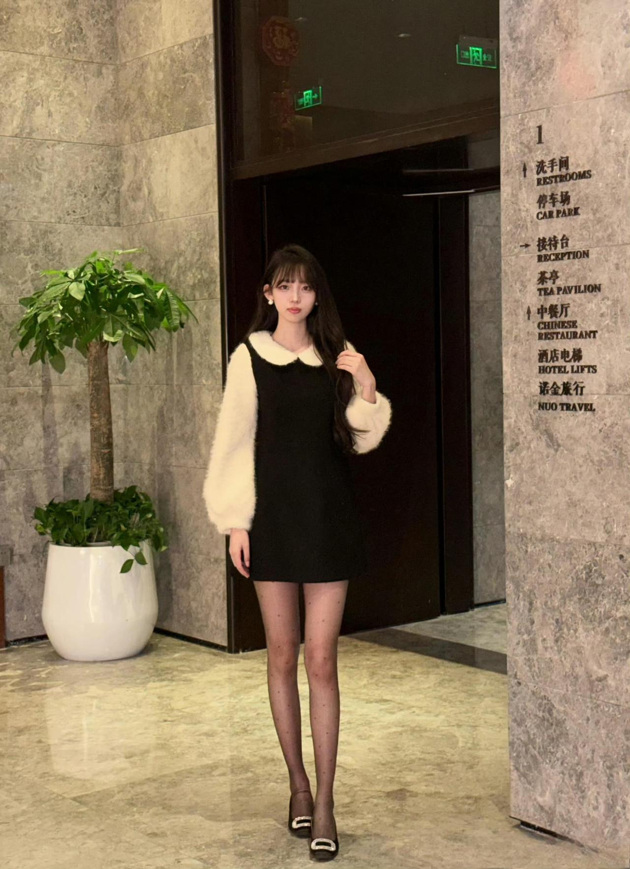 - 单品选了黑底白毛绒拼接连衣裙,娃娃领+毛绒袖是甜美元素,黑色裙身平衡了甜感,短款版型显活泼;