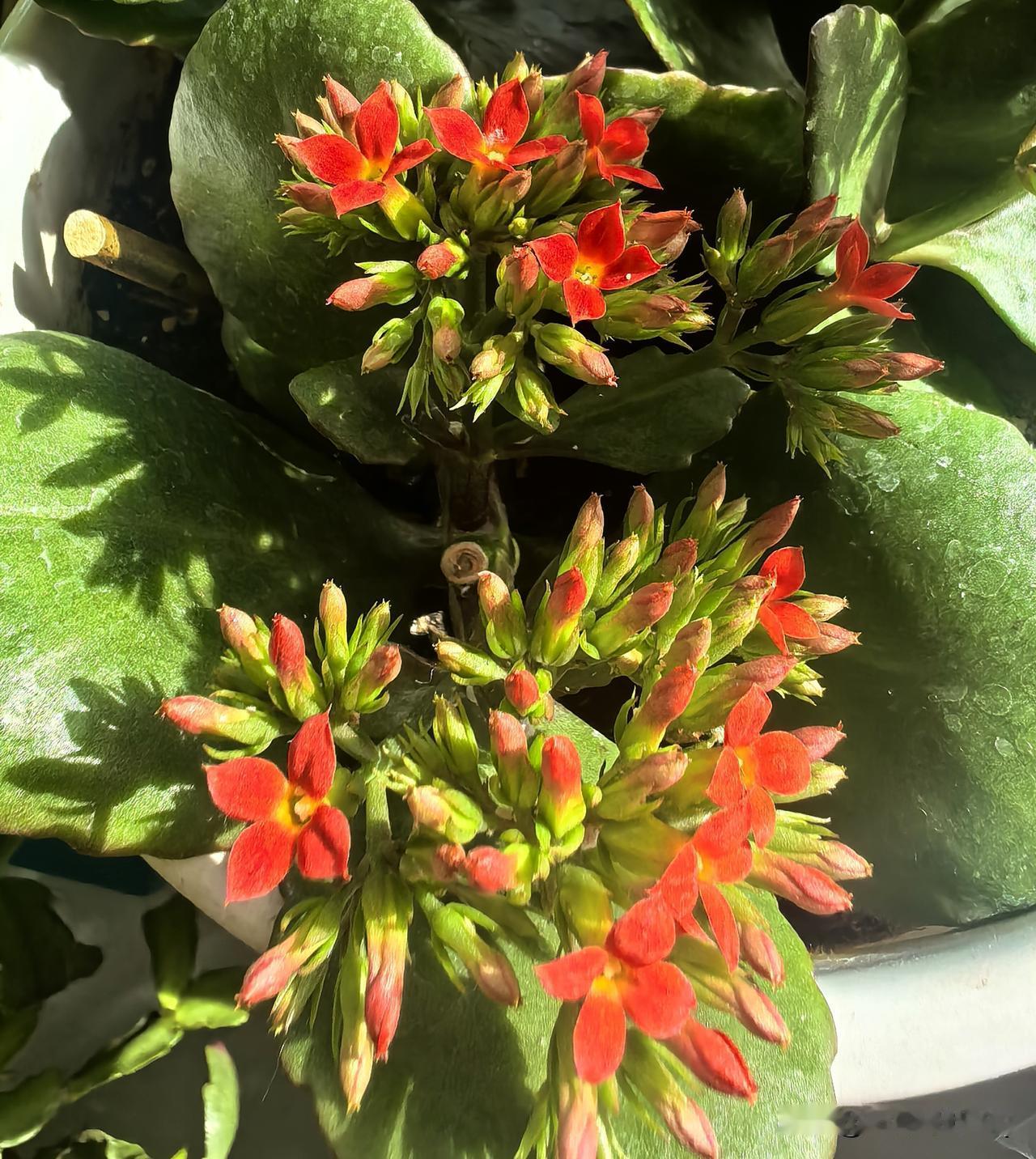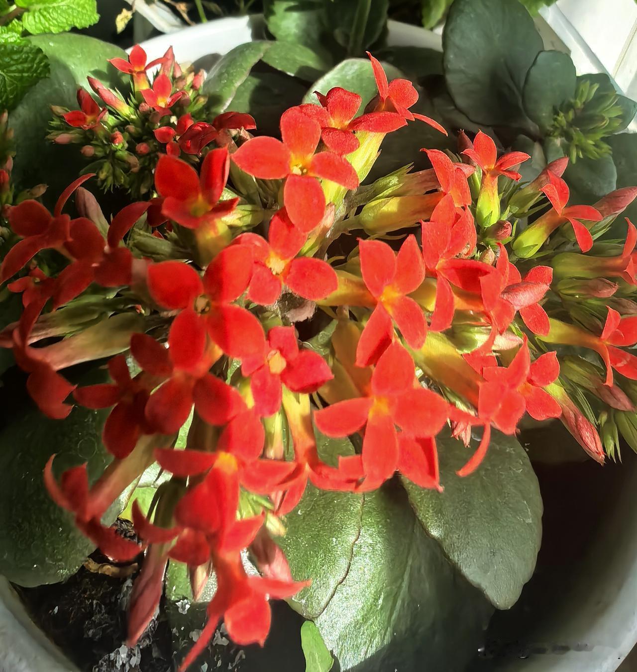 随手扦插的长寿花,如今不仅稳稳活了下来,还热热闹闹地开了一整盆花。这抹浓烈又鲜亮的正红,像一团小小的火焰,点亮了整个窗台,看着就让人心里暖洋洋的,连空气里都飘着喜气洋洋的味道。