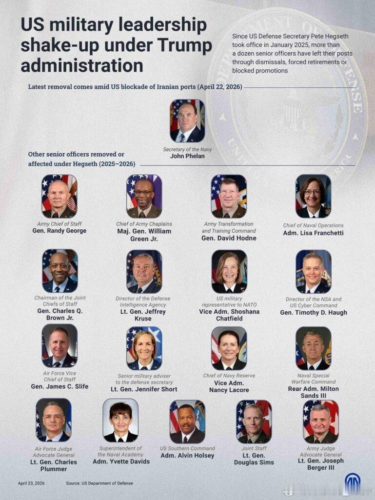 赫格塞斯排长解雇了一大批美军高级将领,最新一起发生在美国对伊朗海上封锁期间:海军部长被解职