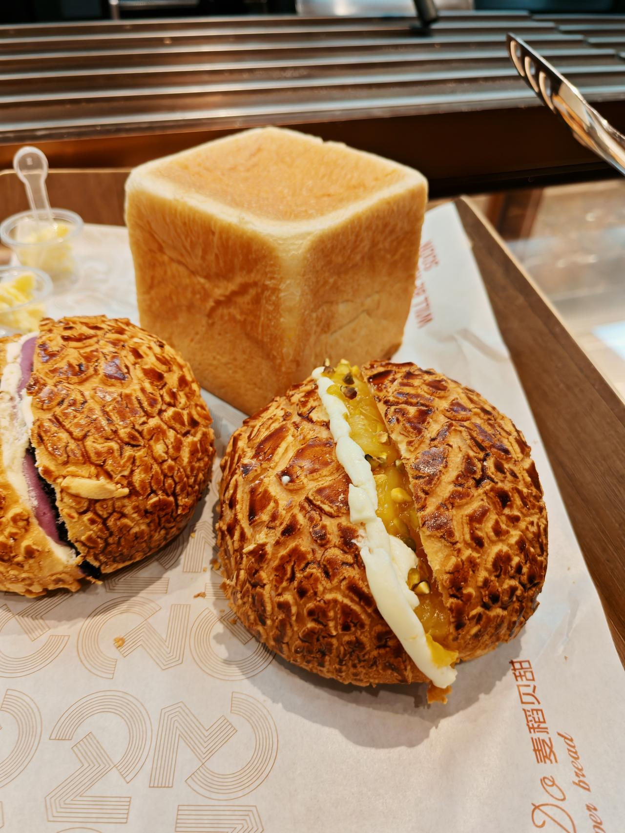 满满果酱的菠萝包,买二送一,正好三个口味,分切开来,每一种都尝一尝,我喜欢菠萝风