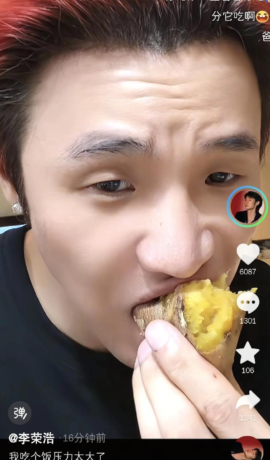 说真的,李荣浩,太难了,一块烤红薯,本来吃得舒舒服服,结果硬是被盯出了罪恶感,想分吧,狗不能乱吃,不分吧,那眼神又让人扛不住,这哪是吃饭,简直是心理素质大考验。