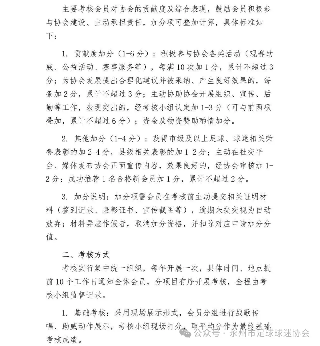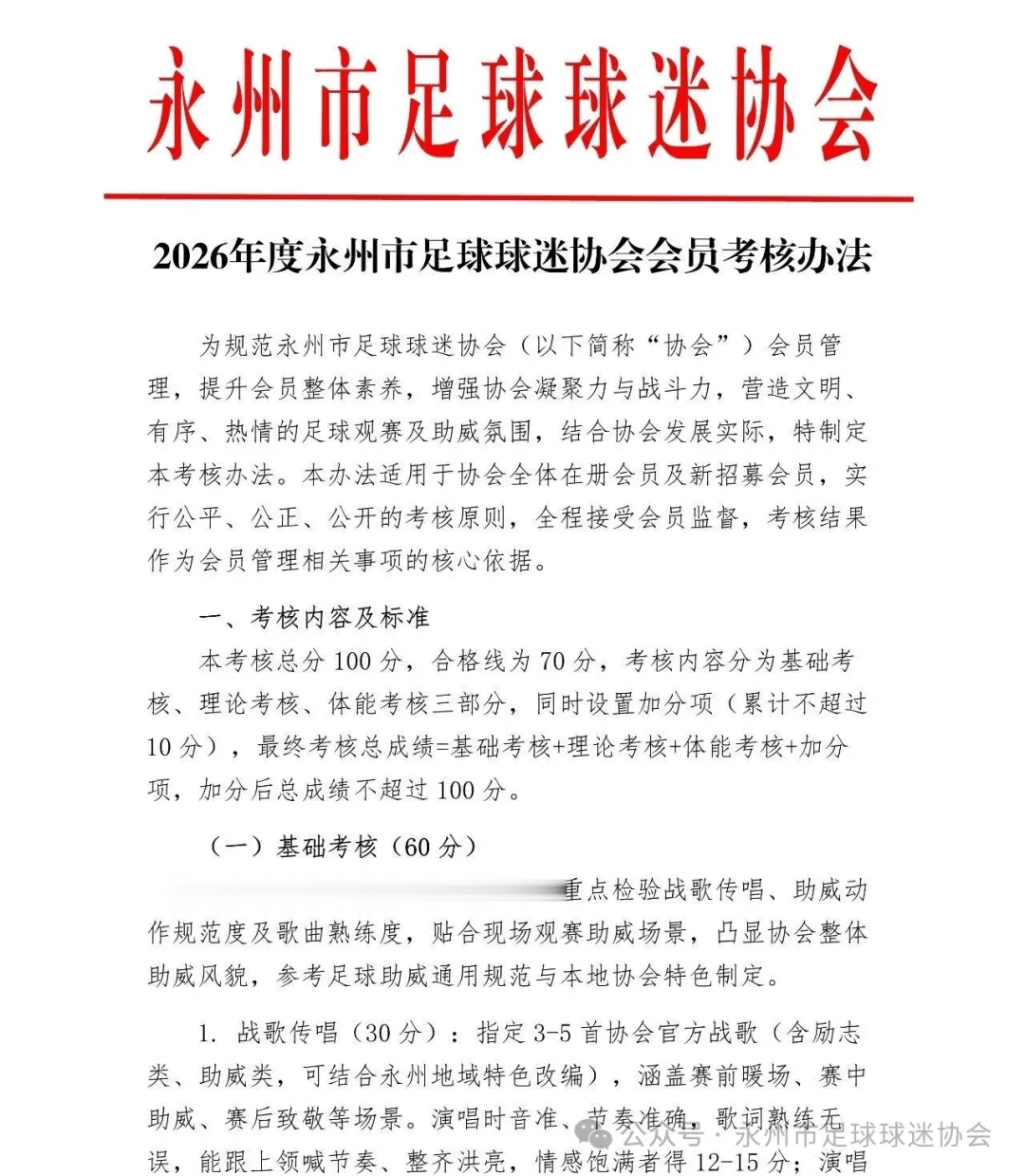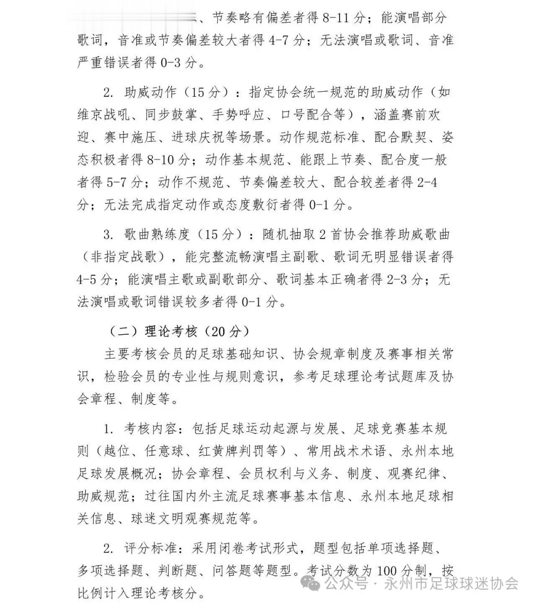 虎扑04月23日讯上赛季湘超冠军永州队的永州市球迷协会发布会员考核办法,考核包括战歌传唱、助威动作、足球基础知识、体能有氧耐力等。