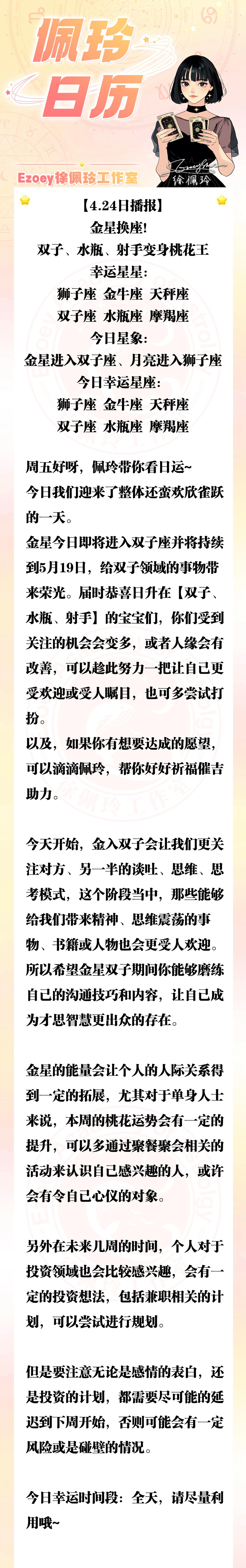 【4.24日播报】金星换座!双子、水瓶、射手变身桃花王 幸运星星:狮子座、金牛座、天秤座、双子座、水瓶座、摩羯座——Ezoey徐佩玲26年星座播报