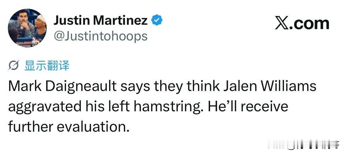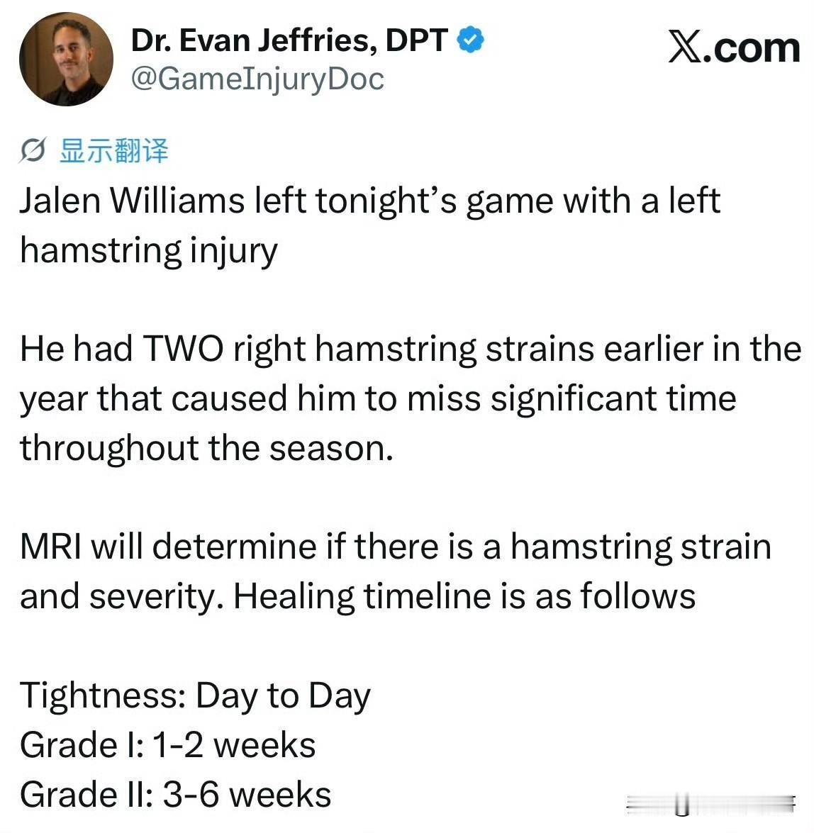 比赛结束后,医学方面专家Dr. Evan Jeffries谈到了杰伦-威廉姆斯的左腿筋拉伤问题,他表示,杰伦威这个伤已经不是第一次了,他已经被这个伤病影响了整个赛季,本赛季他几乎没怎么打比赛。