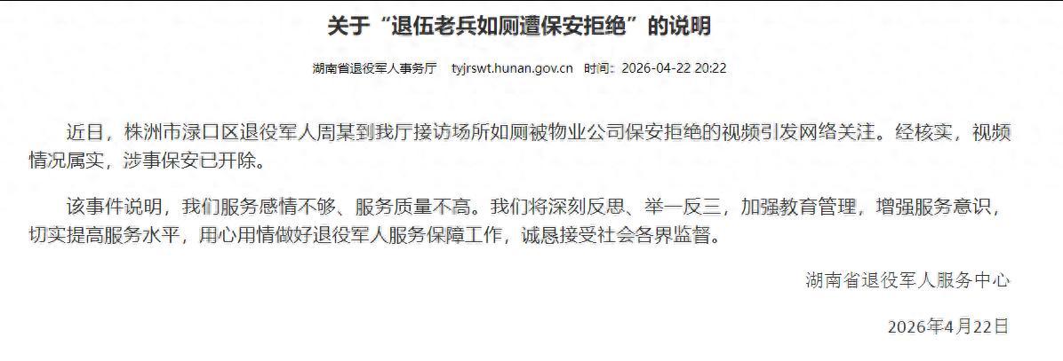 退役军人如厕遭拒后续来了,湖南省退役军人事务厅发布情况进行了回应,称视频反映情况属实,涉事保安已经被开除。