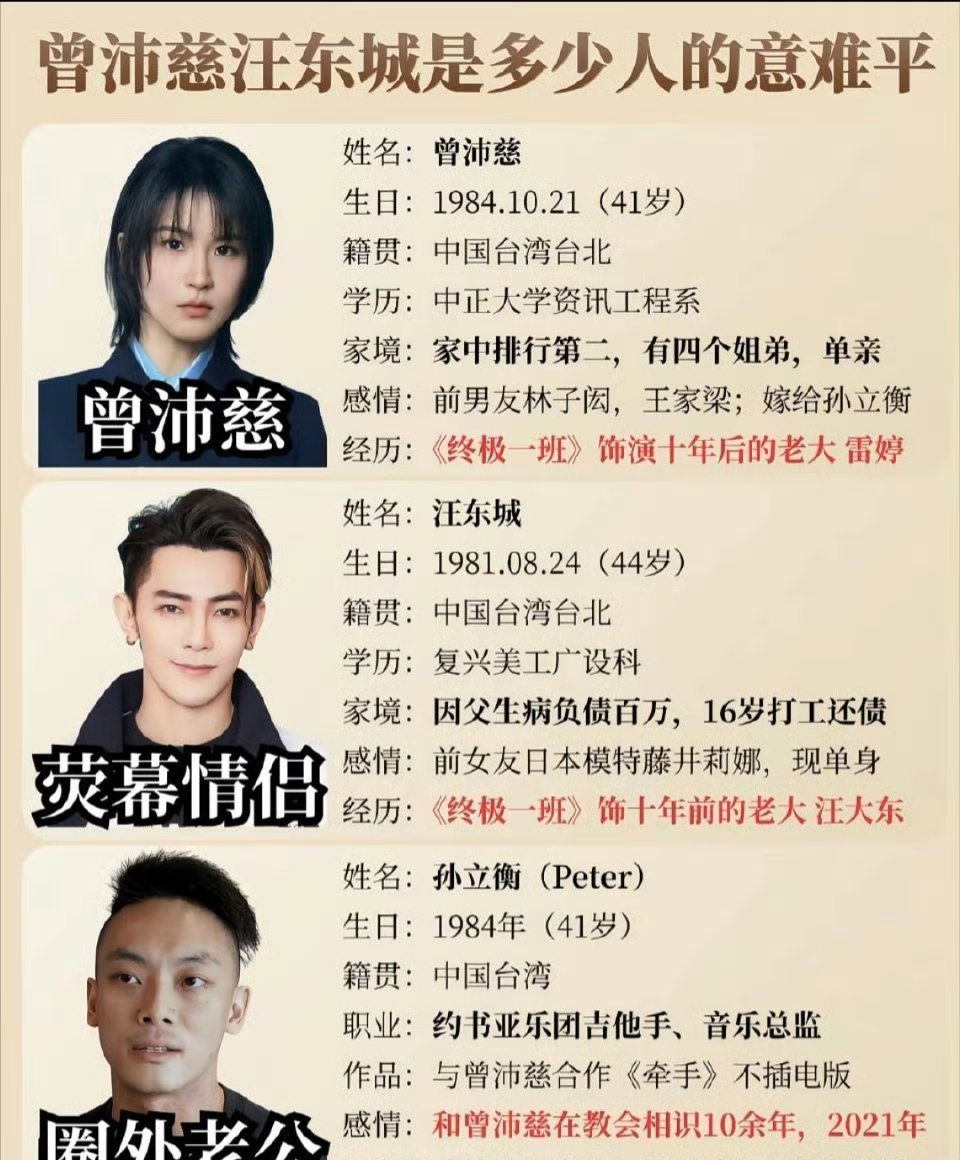 才知道曾沛慈已婚有老公了 好像还是个音乐人。小时候还幻想过她跟汪东城结婚呢