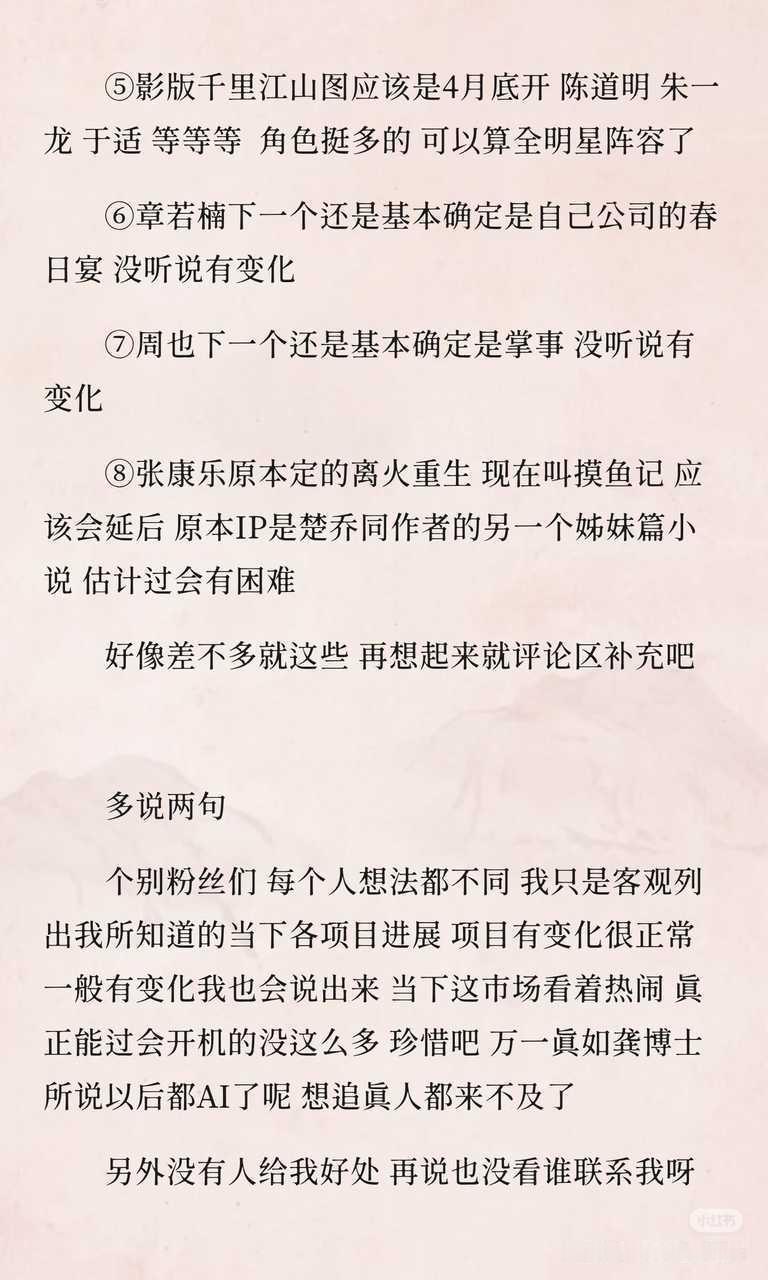 曝丁禹兮卢昱晓主演恰逢雨连天吃momo探发的🍉1卢昱晓下一个档接触最深的是浩瀚的剧 去年就接触了 很深入 不出意外会接2柠萌的恰逢也基本确定了男女主丁禹兮和卢昱晓不过要到Q4差不多11月左右3丁和孟是下一个档期合作 的现代戏 有悬疑元素 不是那种纯偶像剧4代露娃下一个大概率是正午的开盘 女性群像合作的另外两位主演是张小斐和蔡文静几个女性角色人物都很好5影版千里江山图应该是4月底开陈道明朱一龙于适等等等角色挺多的可以算全明星阵容了6章若楠下一个还是基本确定是自己公司的春日宴没听说有变化7周也下一个还是基本确定是掌事 没听说有变化8张康乐原本定的离火重生现在叫摸鱼记应该会延后原本IP是楚乔同作者的另一个姊妹篇小说估计过会有困难