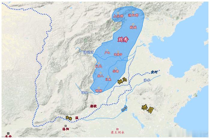 更始元年(公元23年)新朝覆灭后,时任朔调连率(即上谷太守)的耿况派 21 岁的儿子耿弇前往长安觐见更始帝,途中恰好遇到正赴河北招抚的刘秀。