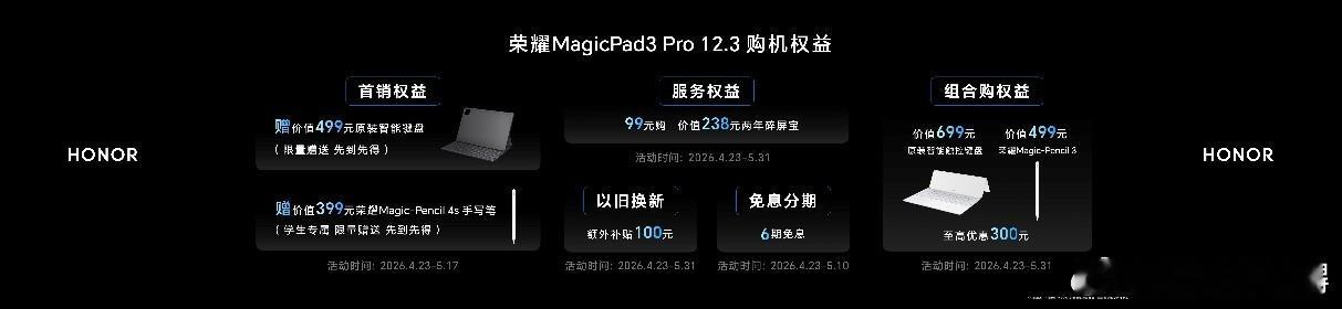 即日起开售,国补优惠价3499元起,前期限时赠送智能键盘或手写笔等福利。荣耀同步发布了WIN系列游戏本、MagicBook Pro系列及头戴式耳机等多款新品。全球最薄OLED旗舰平板荣耀MagicPad3 Pro 12.3正式发布