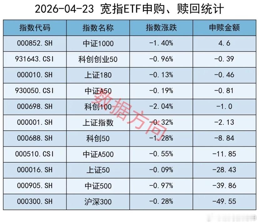 上证50指数(-28.43亿)、中证A500指数(-11.85亿)、科创50指数(-8.84亿),净赎回亦不少。