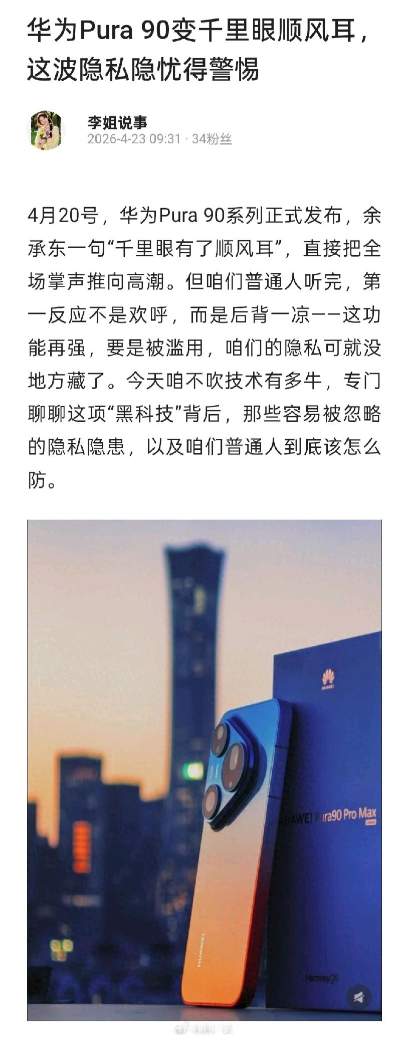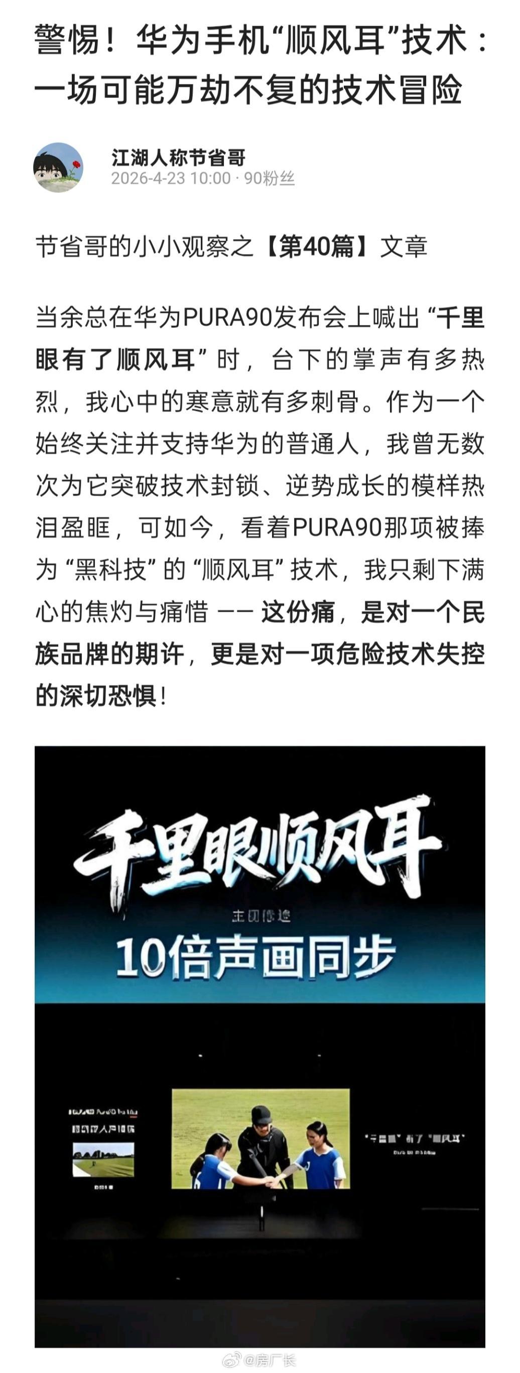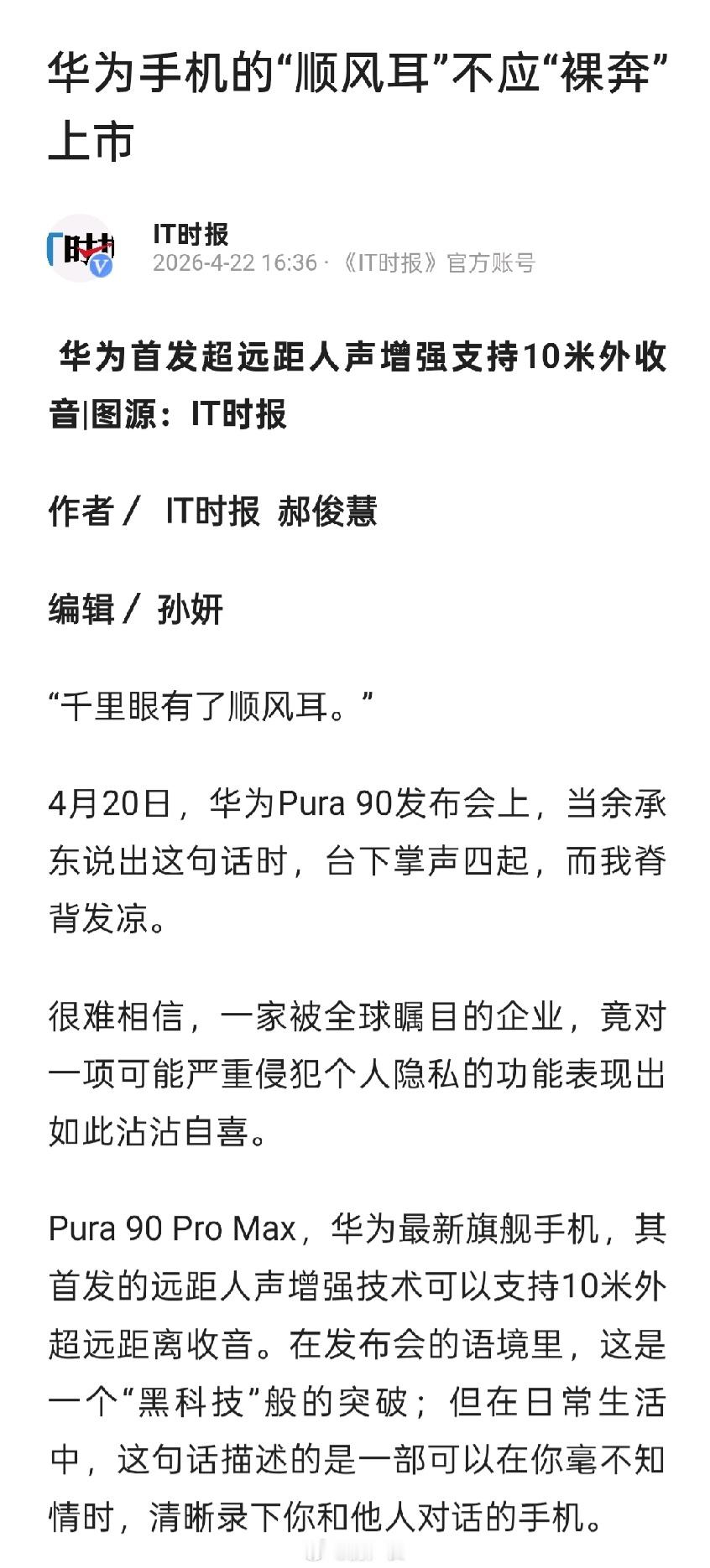 网上开始批判华为的千里眼顺风耳技术了,其它手机也有远距离收音、音频变焦功能,也有专业的收音设备,怎么轮到华为就反思了呢这就像潜望长焦一样,别人都是拍远处风景,你只想到用来拍裤裆