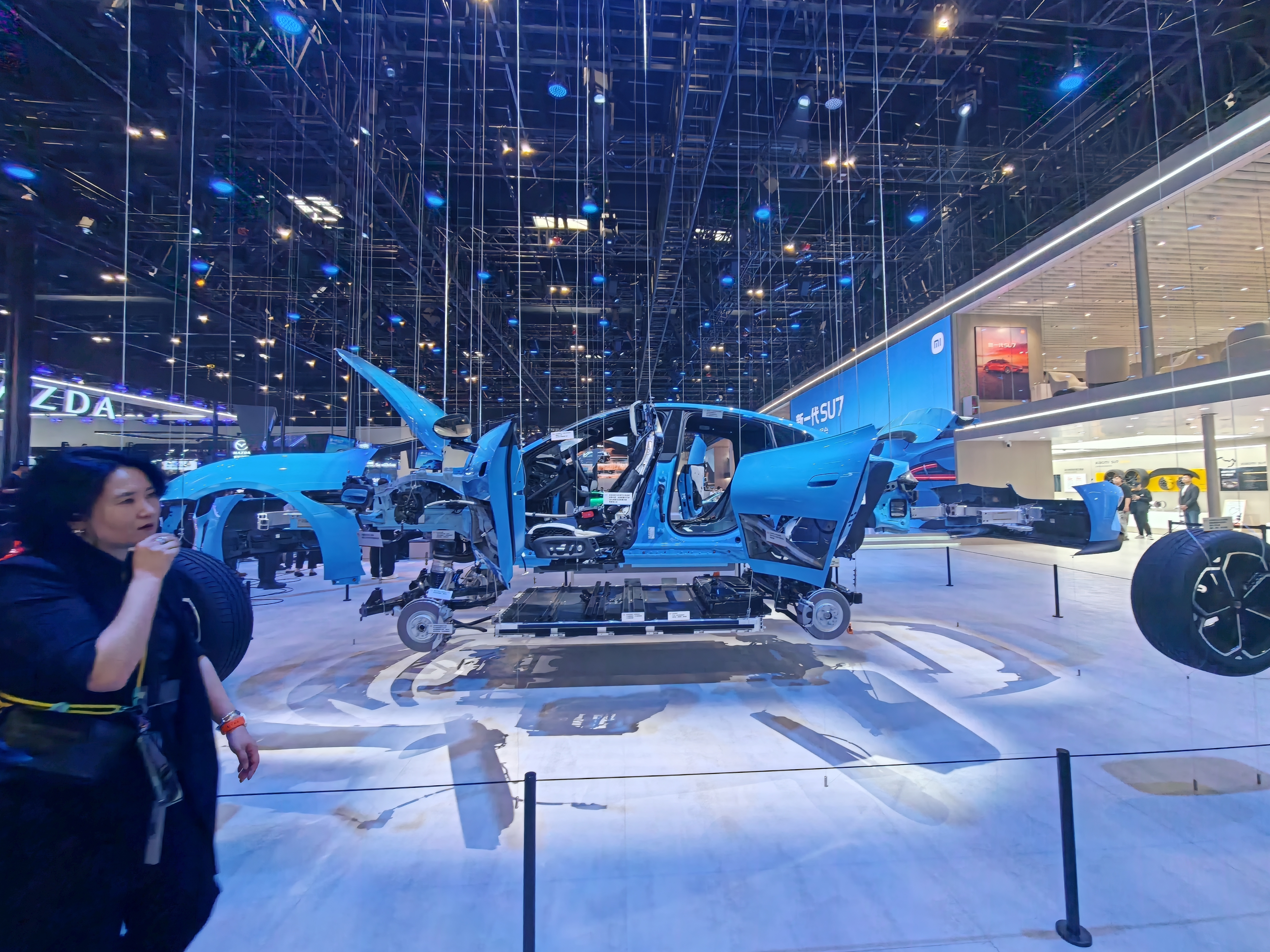 北京车展,小米的展台得来啊,对自己的车型还挺自信的,全拆开给大家看了,看看这个防