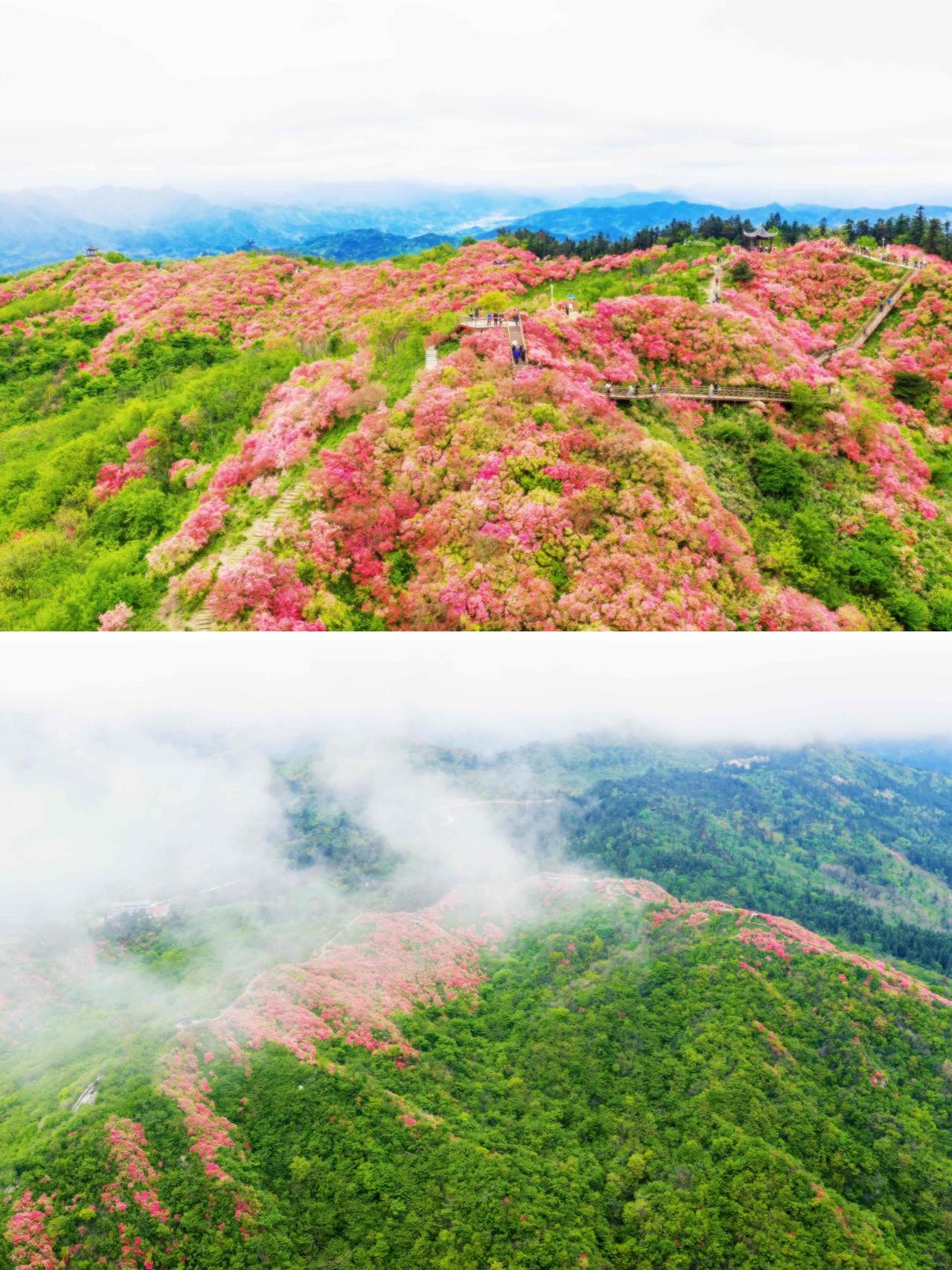 🔸转过山坳,吴家店太平山正烧成火海。四月底到五月初,万亩映山红准时赴约,不是庭院里修剪整齐的盆栽,而是从石缝里、悬崖边、古道上拼命挤出来的野生群落。当整面山坡被染成近乎暴烈的紫红,你会明白大别山的精神底色。
