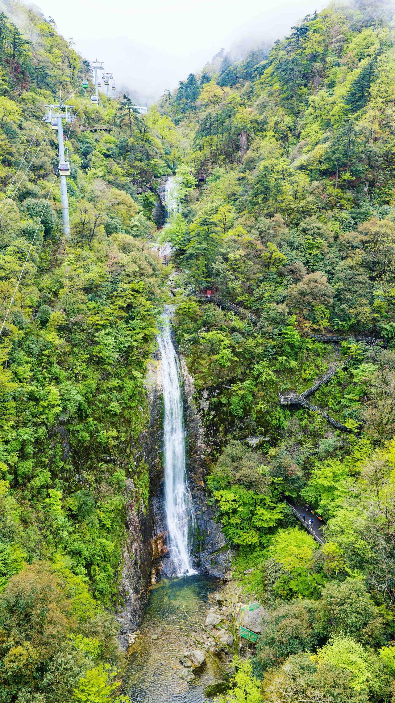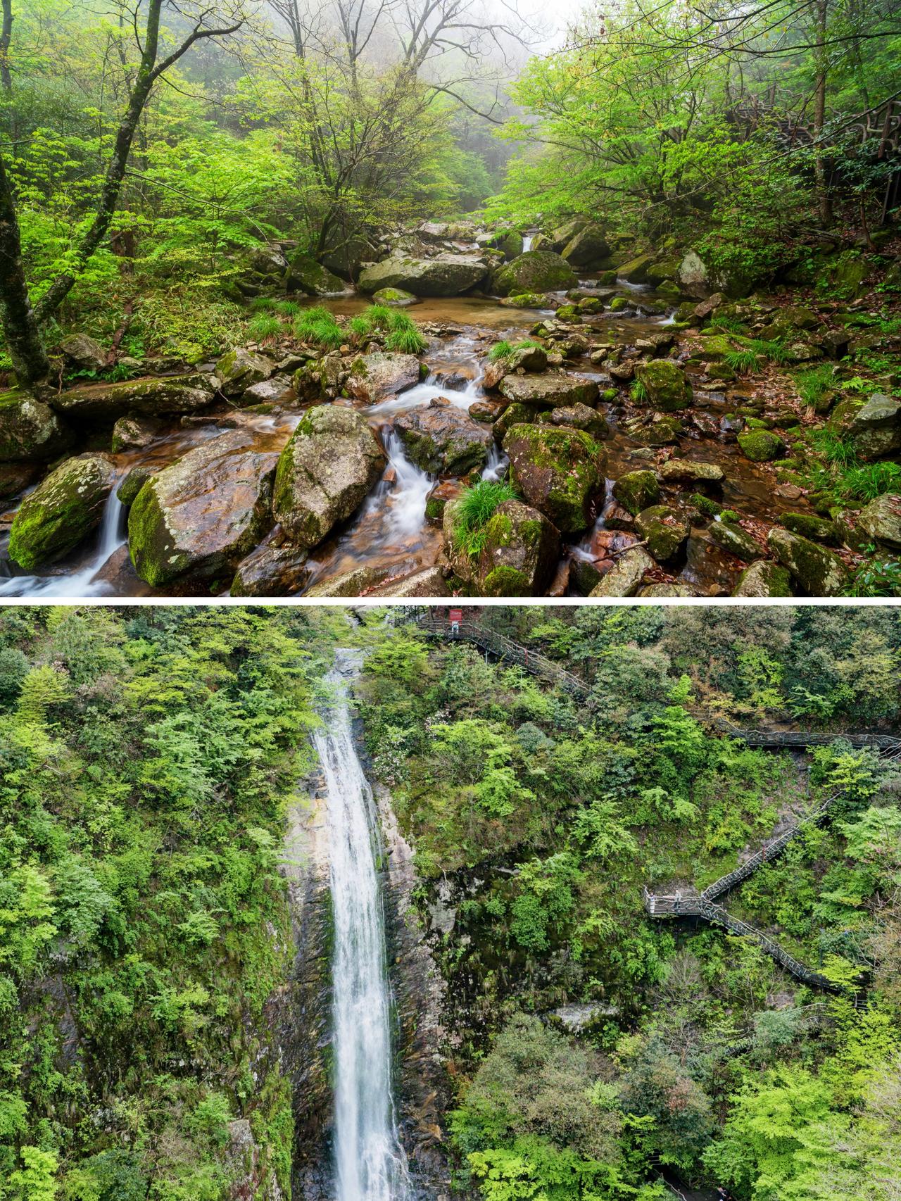 🔸走进天堂寨,水是这里真正的主人,从海拔1729米的大别山主峰倾泻而下,在落差百米的岩壁上碎成万千银链。站在瀑布下仰头,水雾漫过镜头,你会明白国家地理摄影师为何偏爱这里:亿万颗水珠在阳光下折射出完整光谱,而身后的马尾松正把新绿泼满整面山坡。