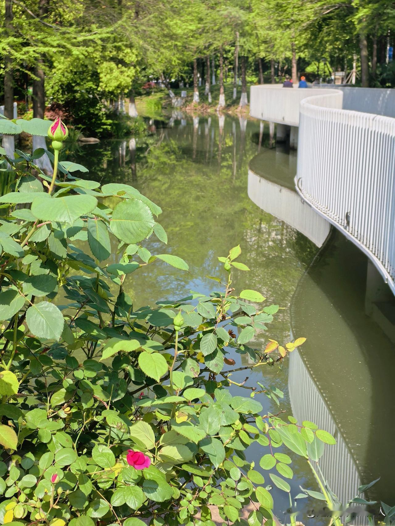 蔷薇花香袭闲人, 一句晚春林木生。 塘蛙低鸣水不语, 好似风过不染尘。
