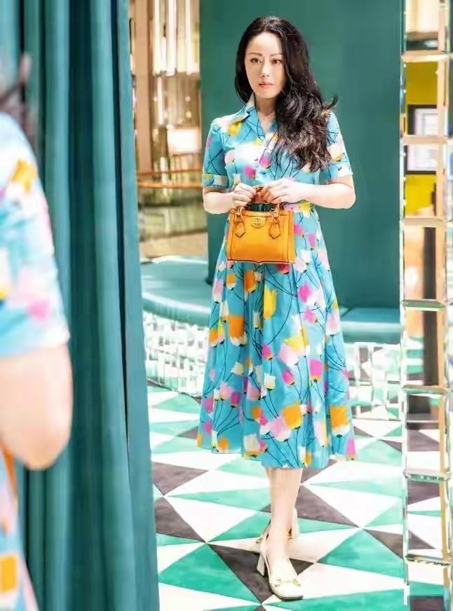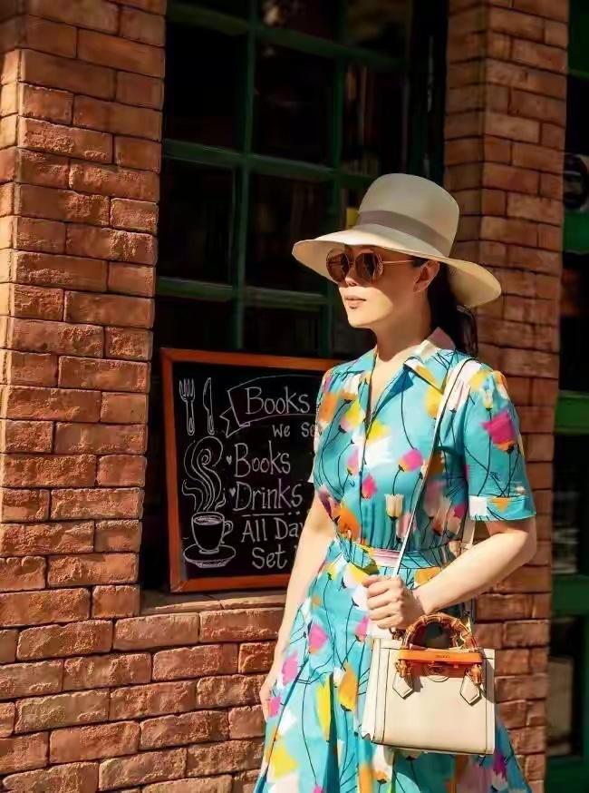 章小蕙的高级感,往往藏在不起眼的细节里,戴上一顶米白色宽檐帽,不仅能遮挡阳光,更给整套造型注入了法式慵懒感,帽檐修饰了脸部线条,与连衣裙的色彩形成呼应,让整体搭配更有层次感,也悄悄提升了气质,搭配的白色手提包简约大气,和白色粗跟鞋呼应,中和了印花的花哨感,又让整体色调更清爽协调,粗跟鞋还兼顾了舒适与优雅,走路自带从容气场。
